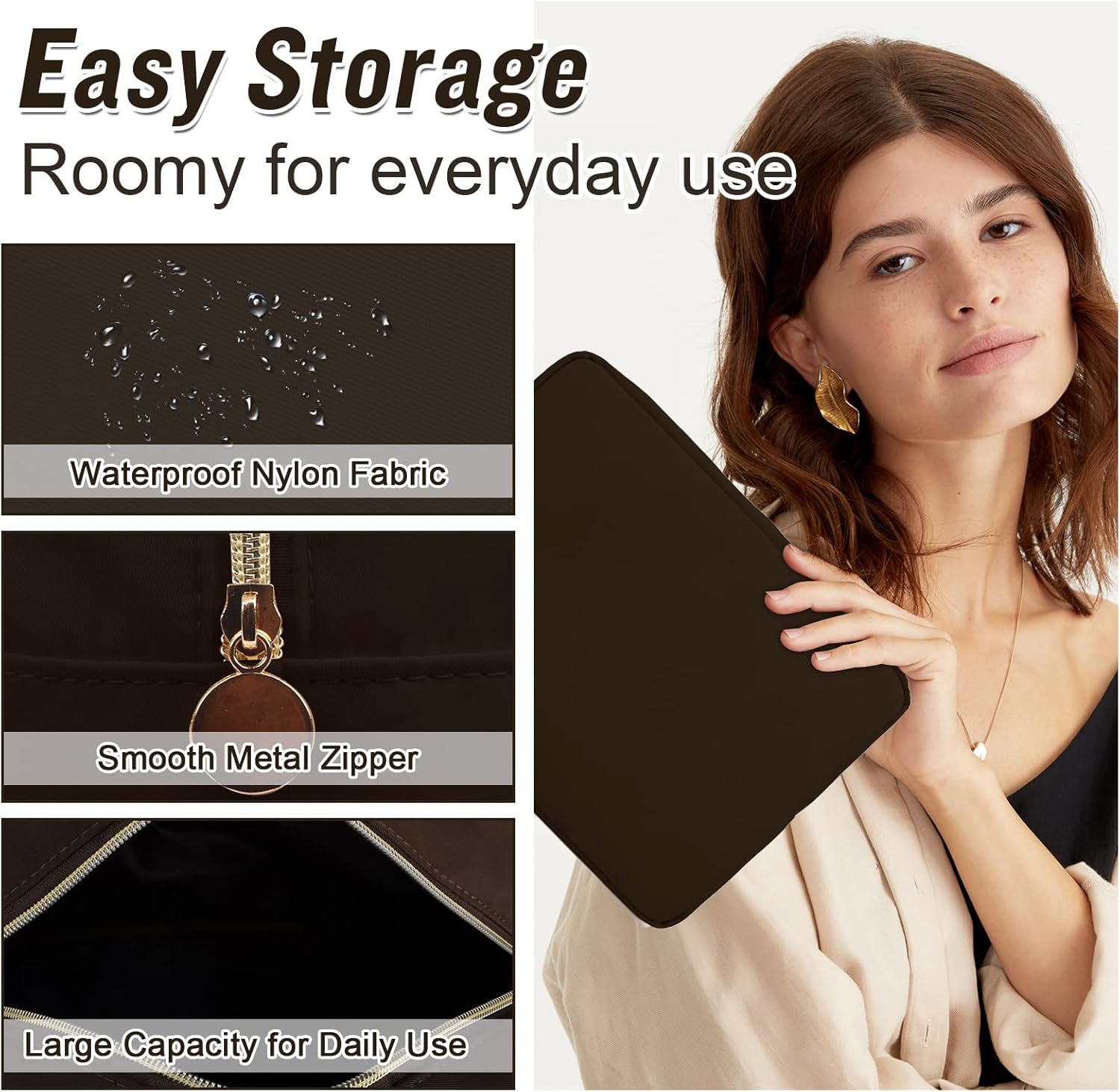 Nylon Large Makeup Bag Travel Pouch for Women, Preppy Big Makeup Bag Cute Cosmetic Zipper Pouch Purse, DIY Chenille Letter Bag Waterproof Toiletry Bag Clutch Make Up Organizer for Women Girls(Brown)