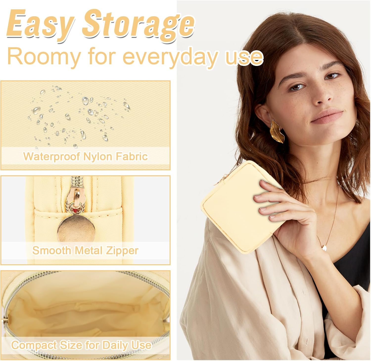 Nylon Mini Makeup Bag for Purse, Preppy Small Cute Makeup Bag Cosmetic Zipper Pouch Purse, Waterproof Travel Coin Pouch Sanitary Napkin Storage Bag Clutch Makeup Organizer for Women Men Girls(Beige)