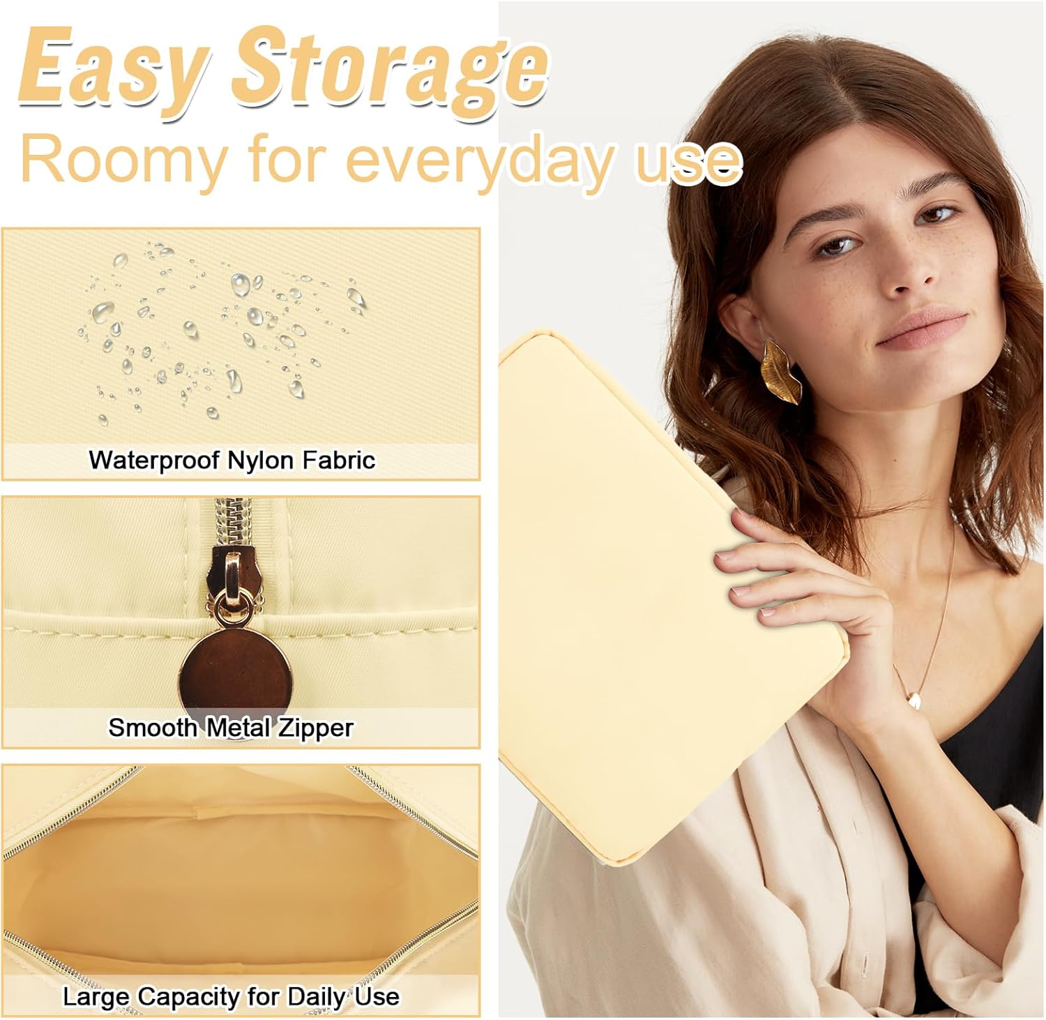 Nylon Large Makeup Bag Travel Pouch for Women, Preppy Big Makeup Bag Cute Cosmetic Zipper Pouch Purse, DIY Chenille Letter Bag Waterproof Toiletry Bag Clutch Makeup Organizer for Girls (Beige)