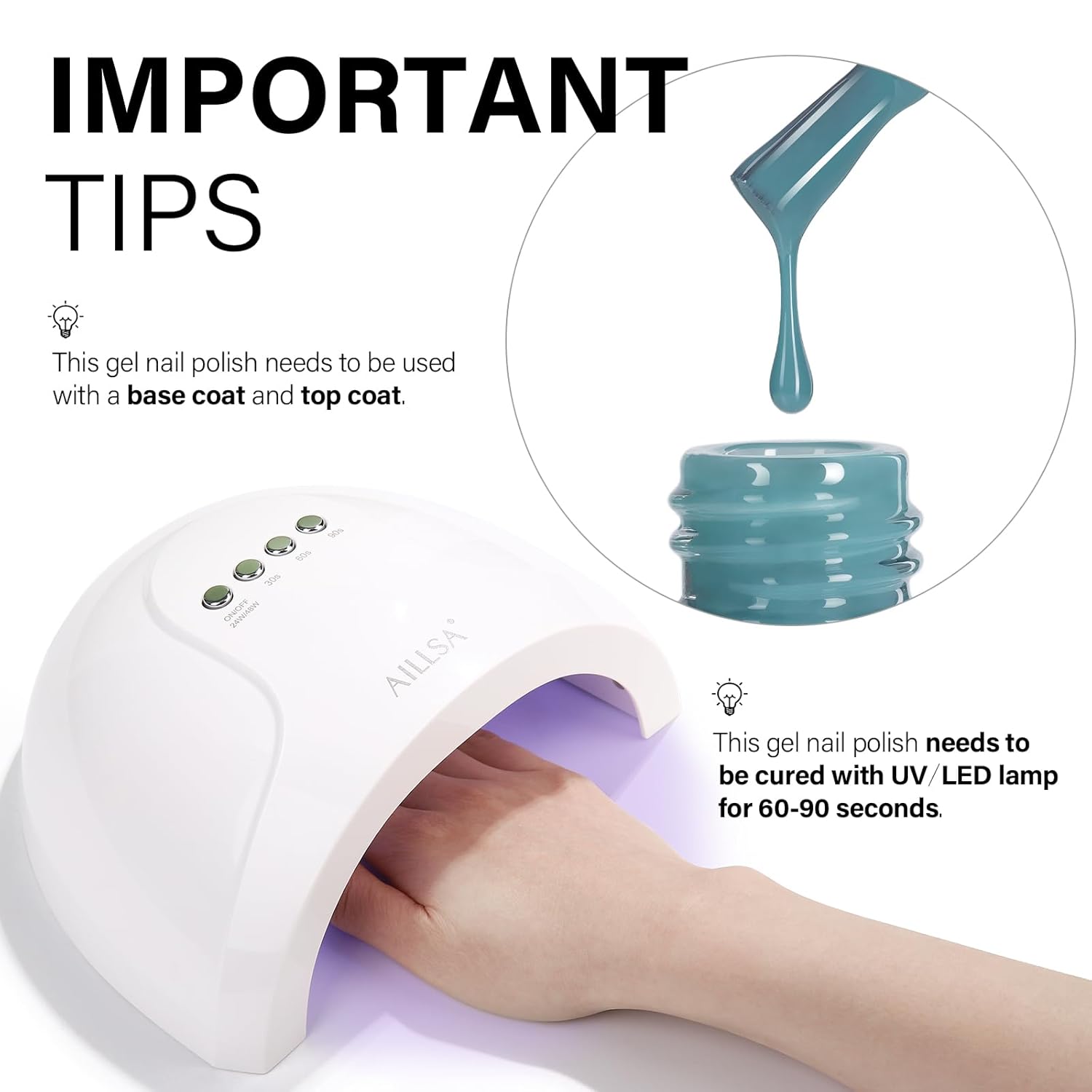 - LONG-LASTING SHINE - AILLSA gel nail polish needs to be cured under L E D/U V lamp, under the correct use steps, it can last for 21-28 days and keep the shiny luster. You'll never have to worry about your nails peeling off while showering and doing housework. Let AILLSA serve you a longer time!