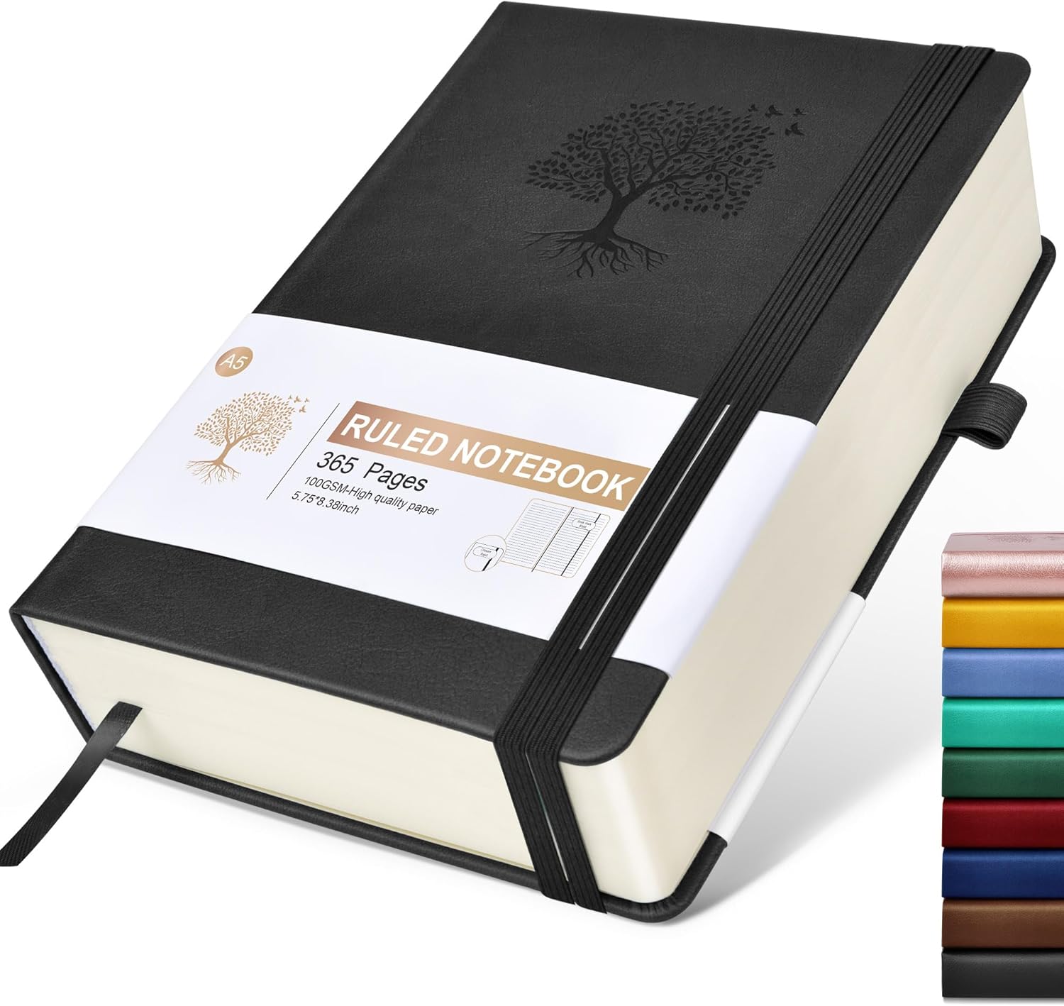 Lined Journal Notebook -365 Pages A5 Thick Journals for Writing Ruled Notebook, Hardcover Leather Journal for Women Men, Daily Journal Notebook for Work, Note Taking, 100Gsm Lined Paper(5.75'' X 8.38'' Black)