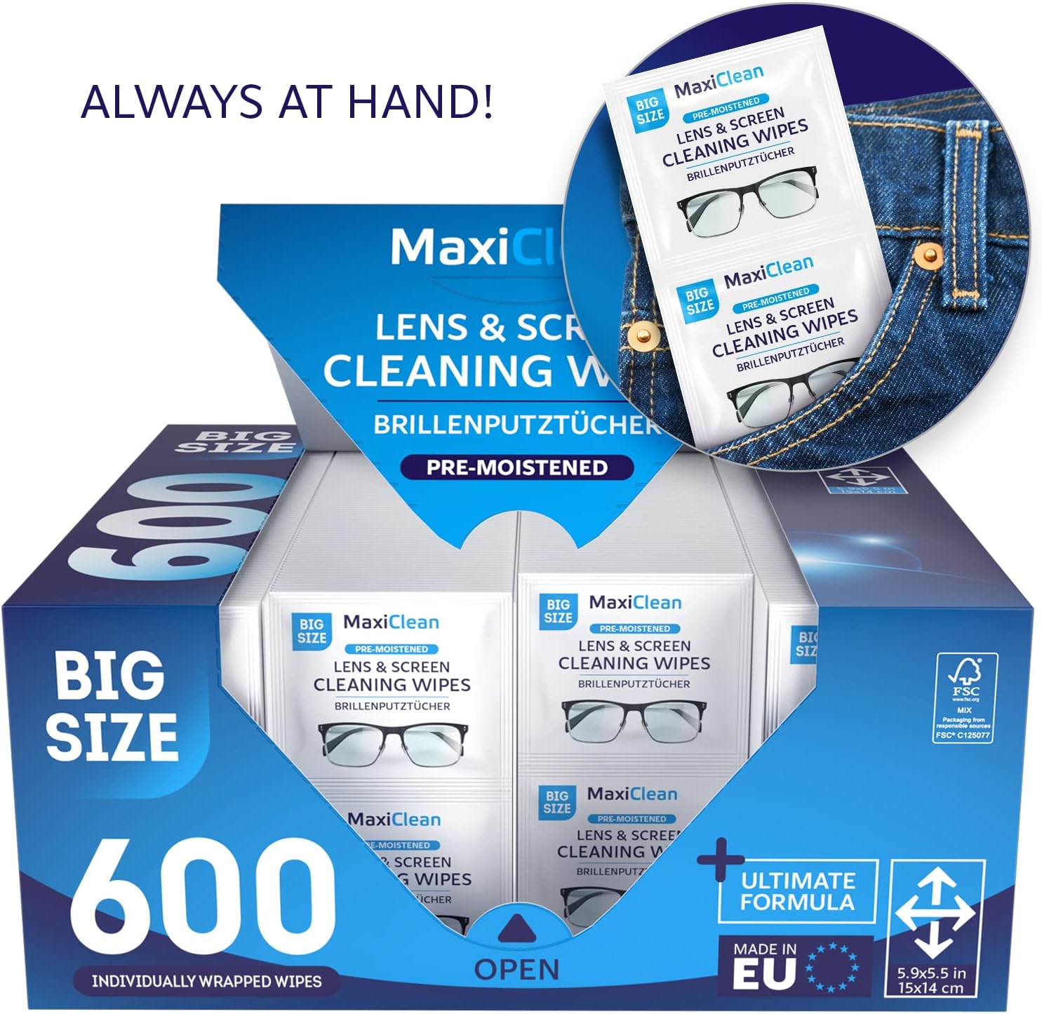 Glasses Wipes Lens Cleaner - Lens Wipes for Eyeglasses - 600 Pre-moistened Individually Wrapped Wipes for Eye Glasses, Electronics, Phone, Computer, Laptop Screen - Camera Lens Cleaner - Made in EU