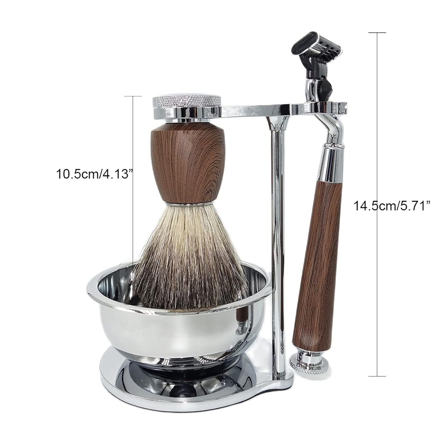 - Ideal Shaving Kit:4 in 1 wet shave kit include Mach 3 triple blade safetry razor,one razor blade refill,badger hair Lather brush,soap bowl and heavy weight stand holder.