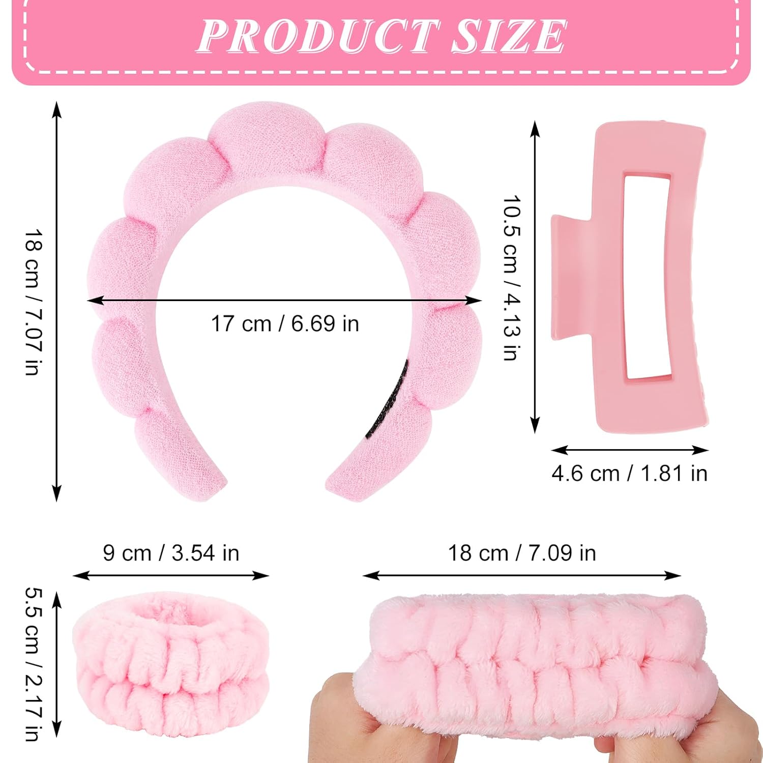Wecoe Spa Headband And Wristband Set Skincare Headband For Washing Face Hair Claw Clips For Thick Hair Cute Pink Puffy Sponge Makeup Bubble Head Band Wrist Towels Scrunchies For Women Girls