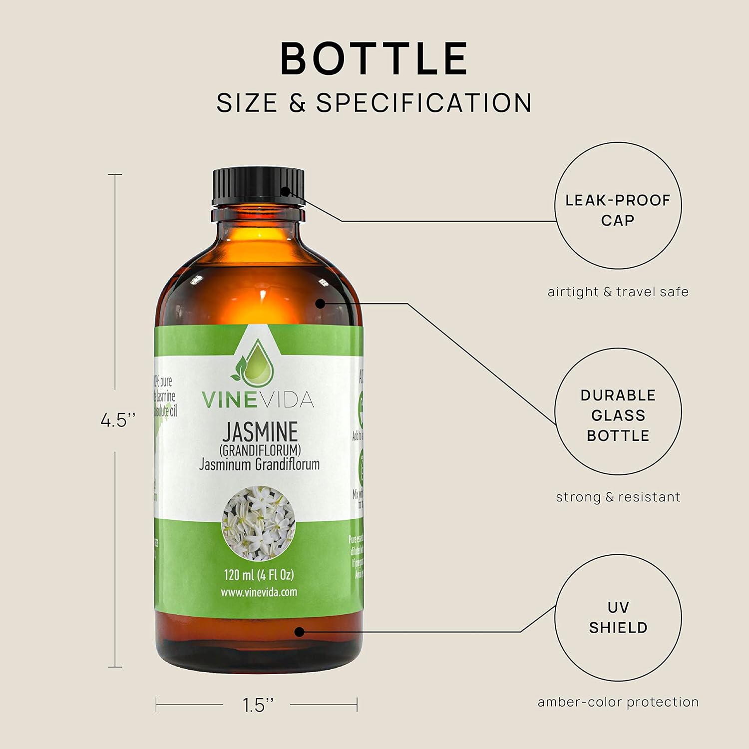 VINEVIDA Jasmine Essential Oil 4 oz - Undiluted Candle Scent DIY Scents for Candlemaking Bulk Soap Making Safe Skin, 7.18 Ounces, 120.0 milliliters, 4.0 Fl Oz, 1