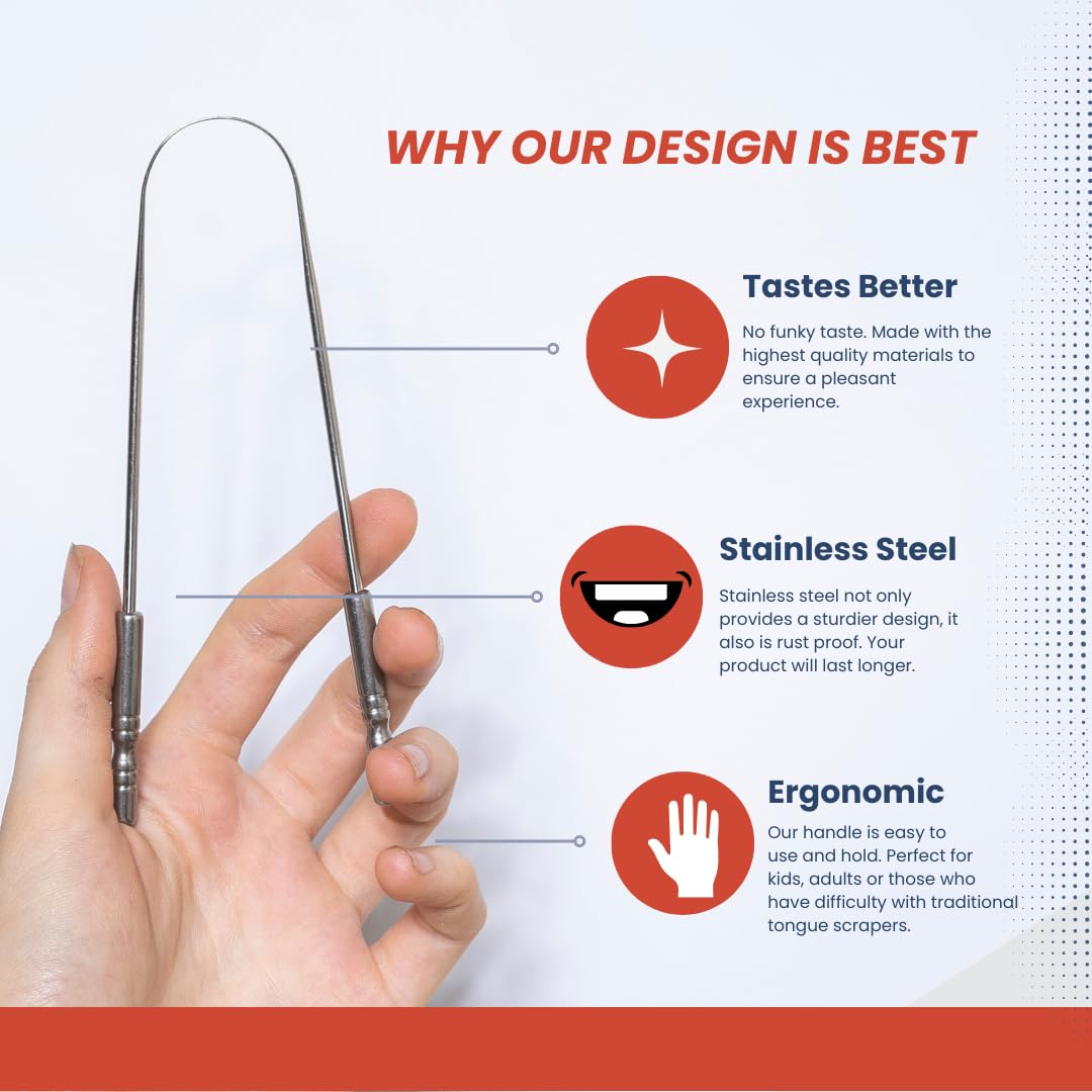 - DESIGNED FOR YOUR COMFORT: Our ergonomic design features a 'U' shaped curve that easily reaches all corners of your tongue. With two non-synthetic handles for a comfortable grip and an anti-gagging ridge for back-of-the-mouth cleaning, our tongue scraper is ultra-smooth and easy to use. It's perfect for adults (men or women), kids, and even pets!