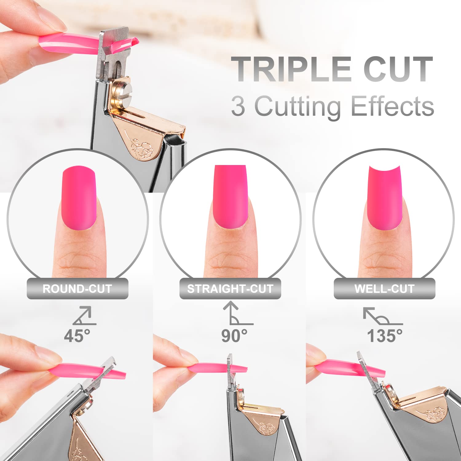 - ❤3 Angles for Nail Art -- This nail clipper features 3 adjustable angles for a flawless manicure and nail art. Hold it at 45° for round nails, 90° for square nails, and 135° for round nails.