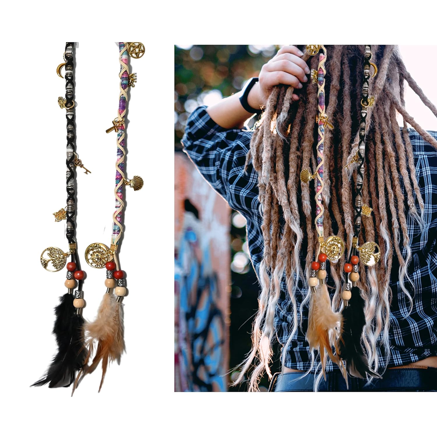 2 PCS Hippie Hair Extension Dreadlocks Hairclip Feather Beads Pendant Dread Wrap Hair Fall Hair Wrap Colorful Accessories for Dreads Braids Curls
