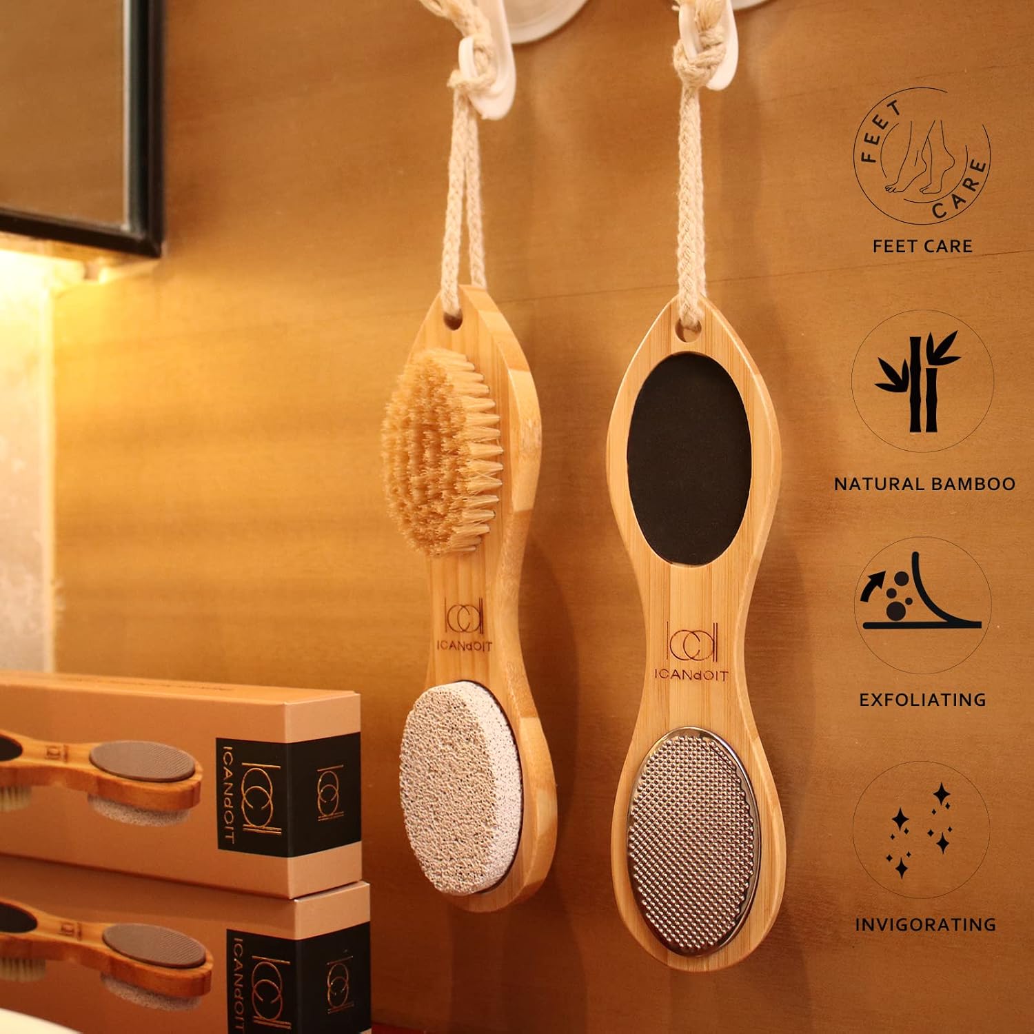ICANdOIT-2 Packs Natural Bamboo Foot File Callus Remover-Multi Purpose 4 in 1 Feet Pedicure Kit with Boar Bristle Brush,Pumice Stone,Foot Rasp,Sand Paper