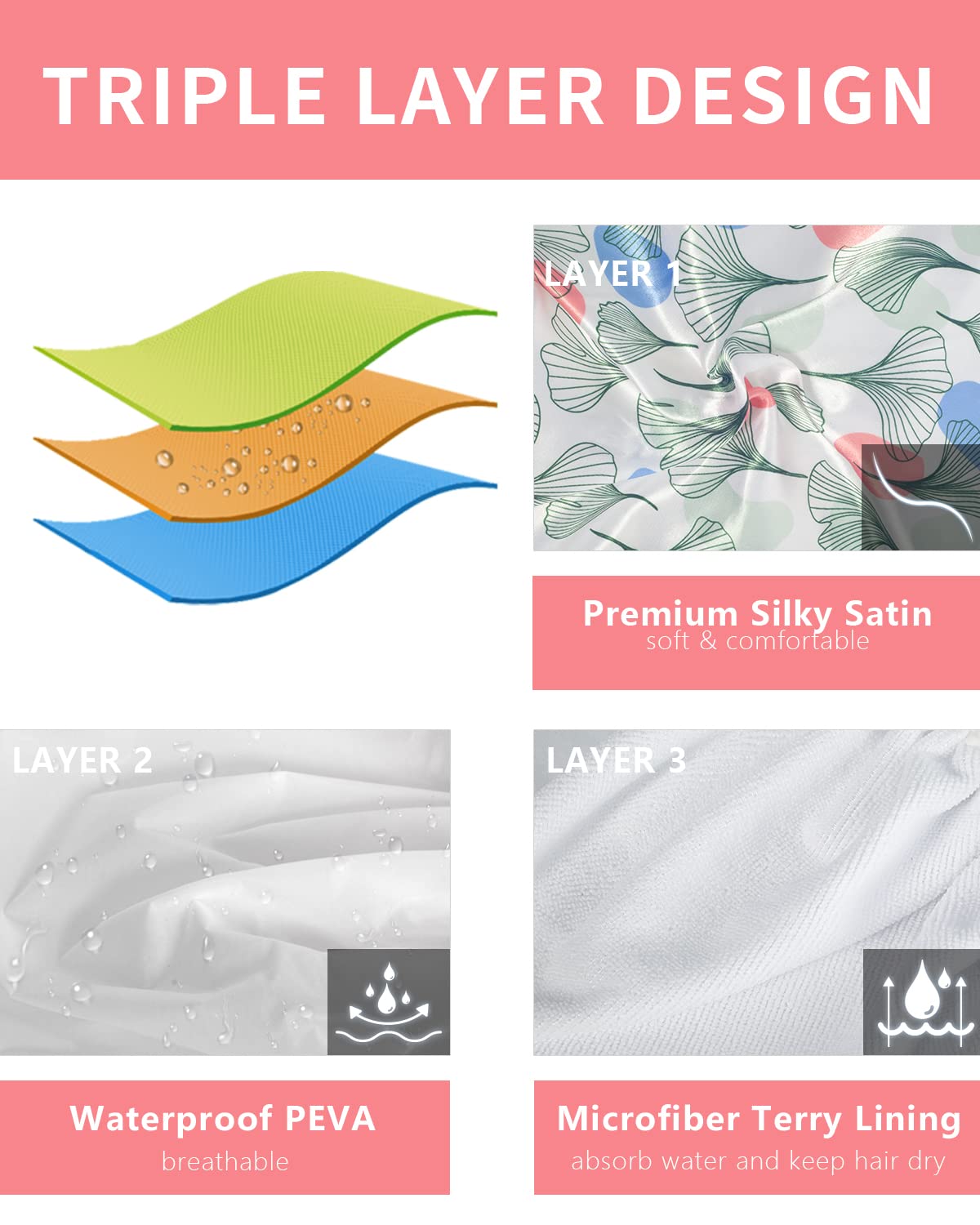 - 【TRIPLE-LAYER DESIGN】Our waterproof shower caps are made with a soft satin fabric, waterproof EVA cloth, and terry cloth for extra absorption. Say goodbye to soggy hair