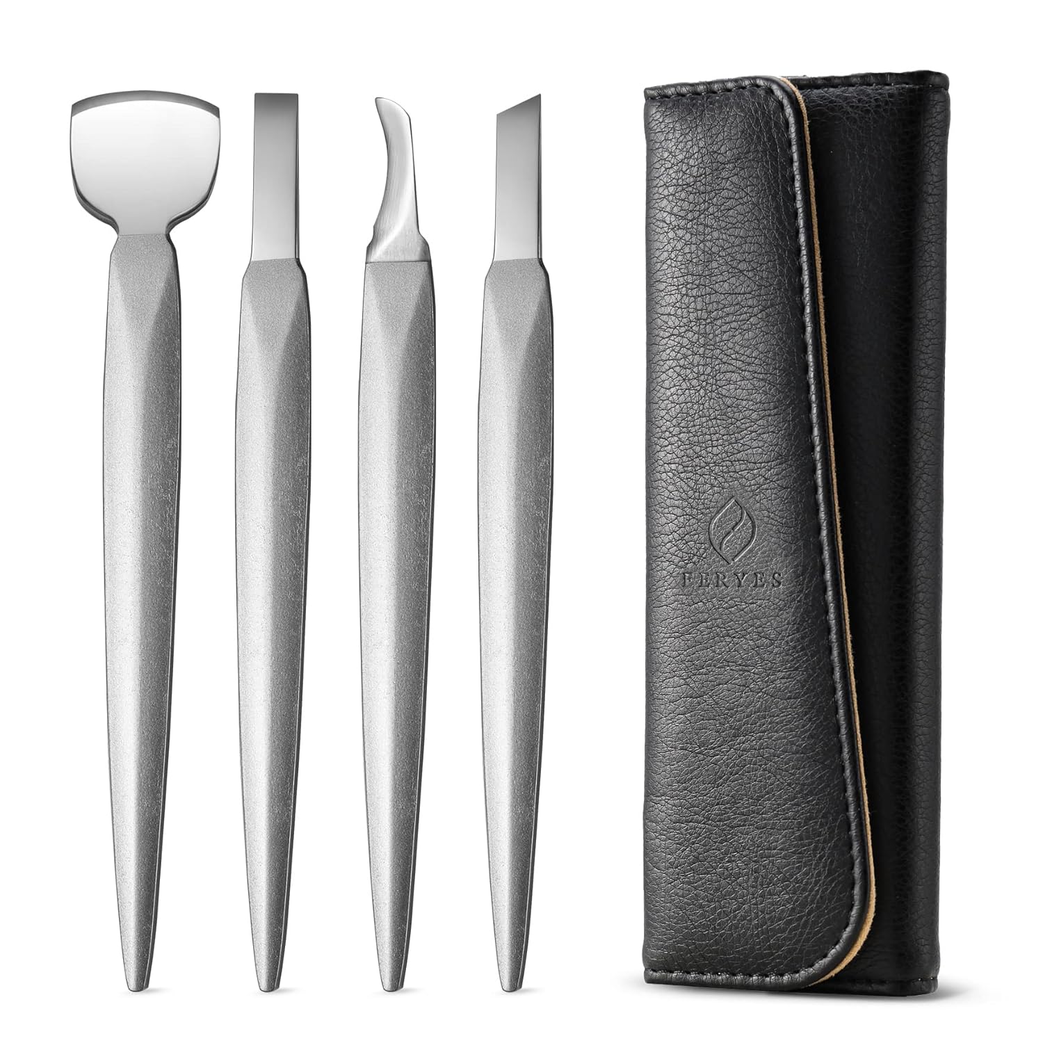- 4PCS Powerful Pedicure Tool Kit: - FERYES pedicure toolkit features four powerful toenail grooming tools, including a wide-curved blade knife, slant blade knife, flat blade knife, strip blade knife