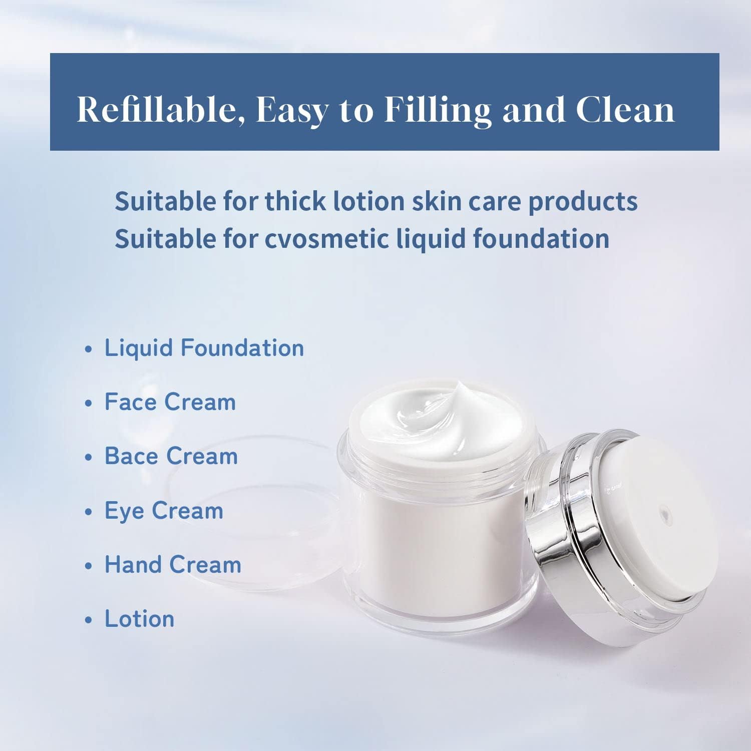 - Durable Material: The airless pump jars are made of acrylic, silicone, plastic material, durable and lightweight, leak proof and spill proof, reusable and convenient to carry.