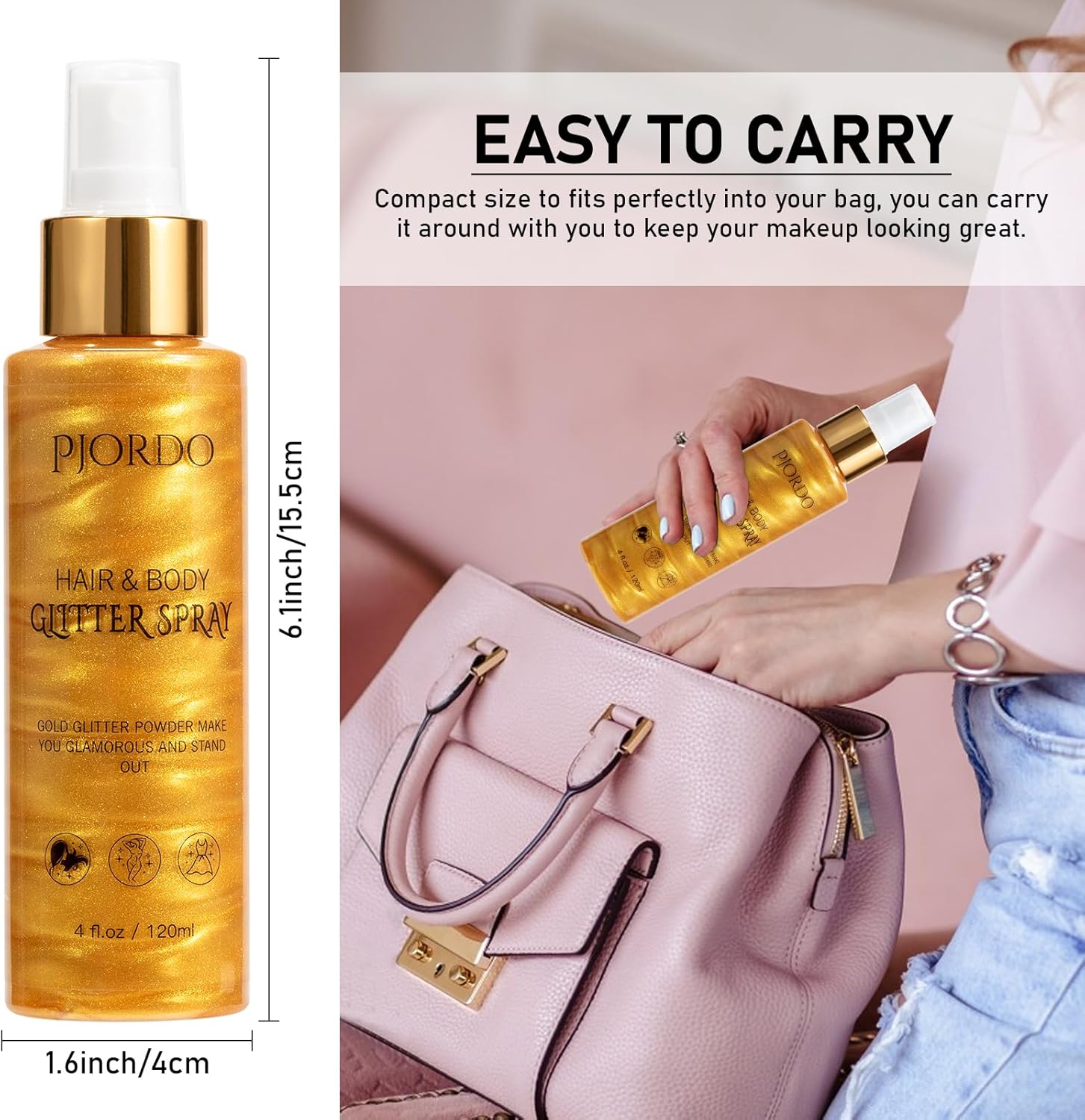 - Gold Glitter Spray: Gold shimmer spray can be used on the body, hair, and clothes to create a head to toe shimmering effect. Effectively enhances face and body contours with dimension and sparkle, matching perfectly with any makeup and outfit. Long-lasting sparkle, fast drying, non oily and non sticky.