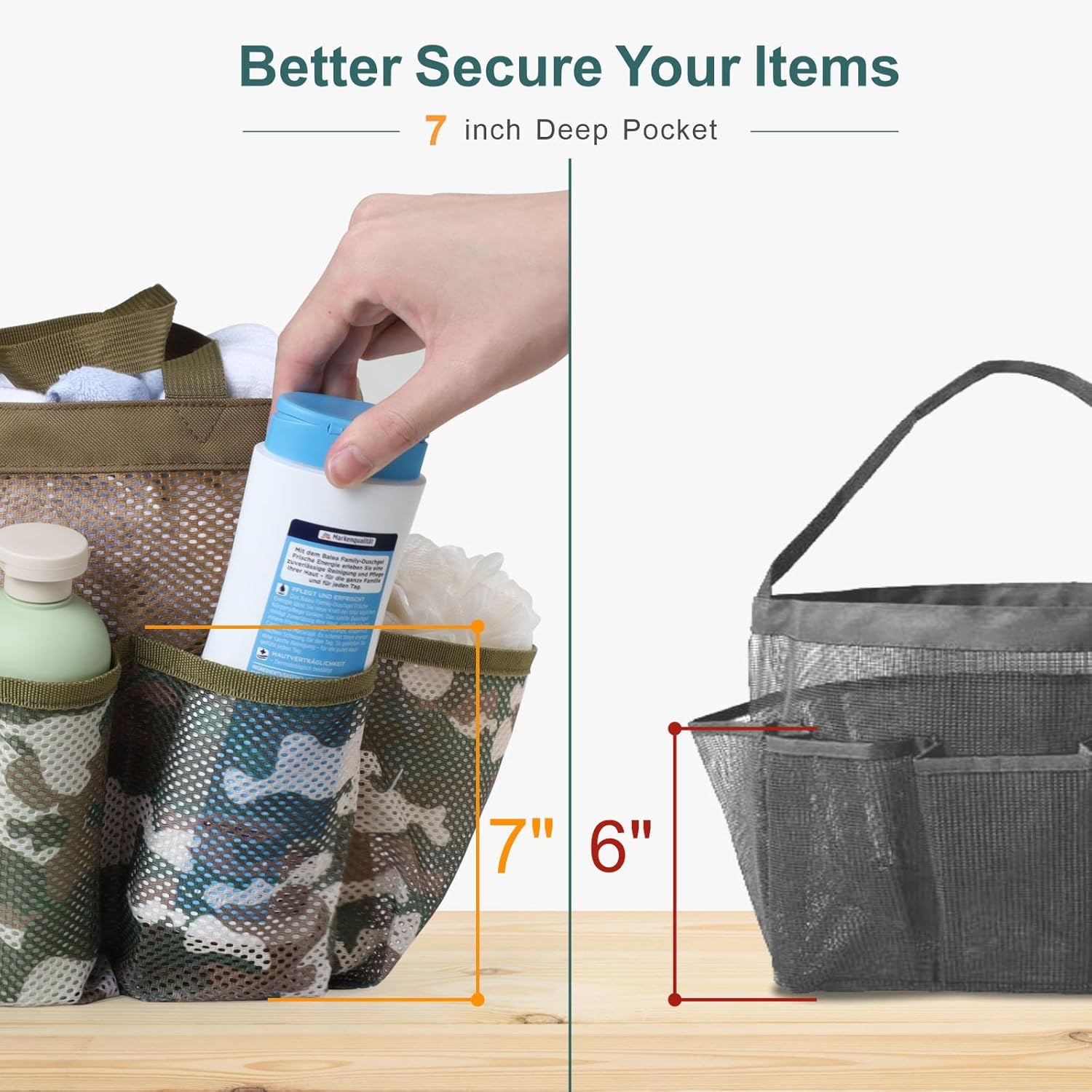 - 7 Upgraded Deep Pockets for Extra Security: With seven exterior pockets (7" deep), this shower tote bag keeps tall bottles upright and secureâno spills or lost items, even on the go