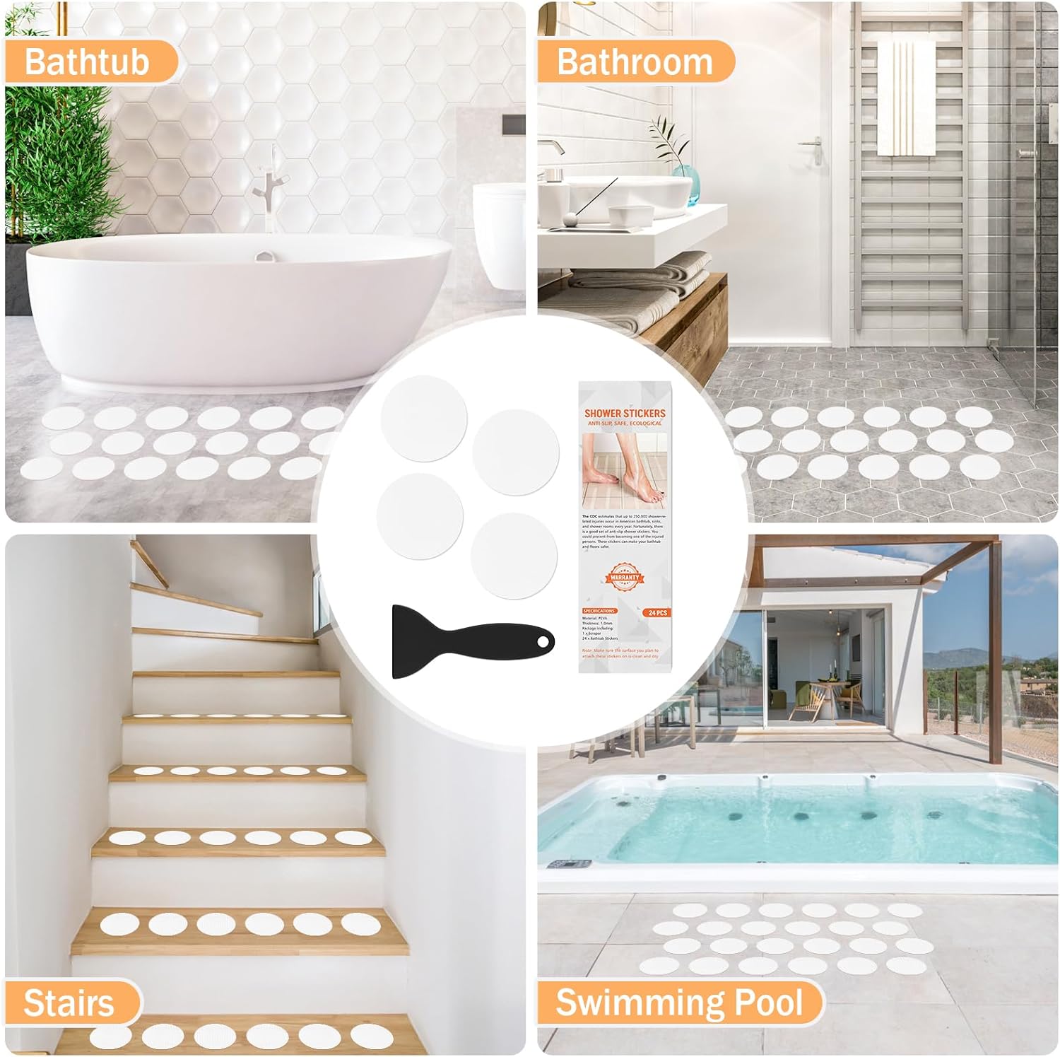Non Slip Bathtub Stickers, 24 PCS Shower Stickers for Safety Bathroom Tubs, Bathtub Non Slip Stickers and Adhesive Decals Scraper for Bath Tub, Shower Floor, Stairs, Ladders(Round Shape, White)