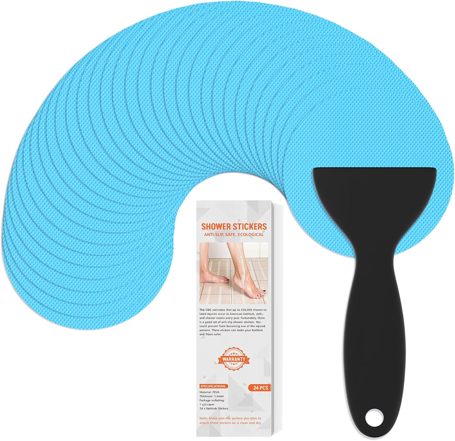 Non Slip Bathtub Stickers, 24 PCS Shower Stickers for Safety Bathroom Tubs, Bathtub Non Slip Stickers and Adhesive Decals Scraper for Bath Tub, Shower Floor, Stairs, Ladders(Round Shape, Blue)