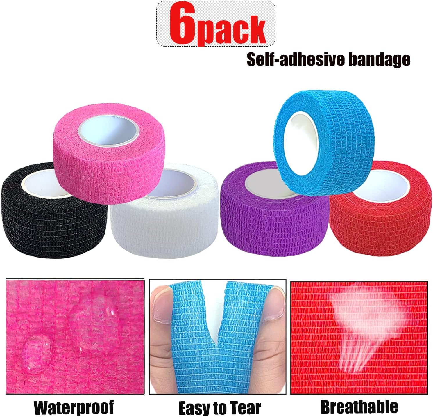 - Package Include: 6 rolls self sticking bandage wrap which is individually packed each roll. Comes with 6 different colors, black, white, red, purple, pink, blue.