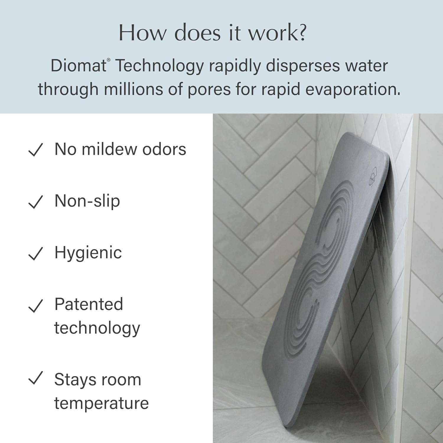 - QUICK-DRYING DIATOMACEOUS EARTH: Our Diatomaceous Earth Stone Bath Mat absorbs up to 150% of its weight in moisture that evaporates within seconds. This ceramic-like material feel