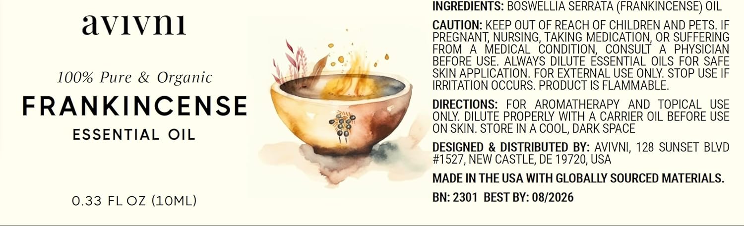 Avivni Frankincense Essential Oil - 100% Pure & Natural, Undiluted for Aromatherapy, Hair, Muscle, Diffuser (0.33oz - 10ml)