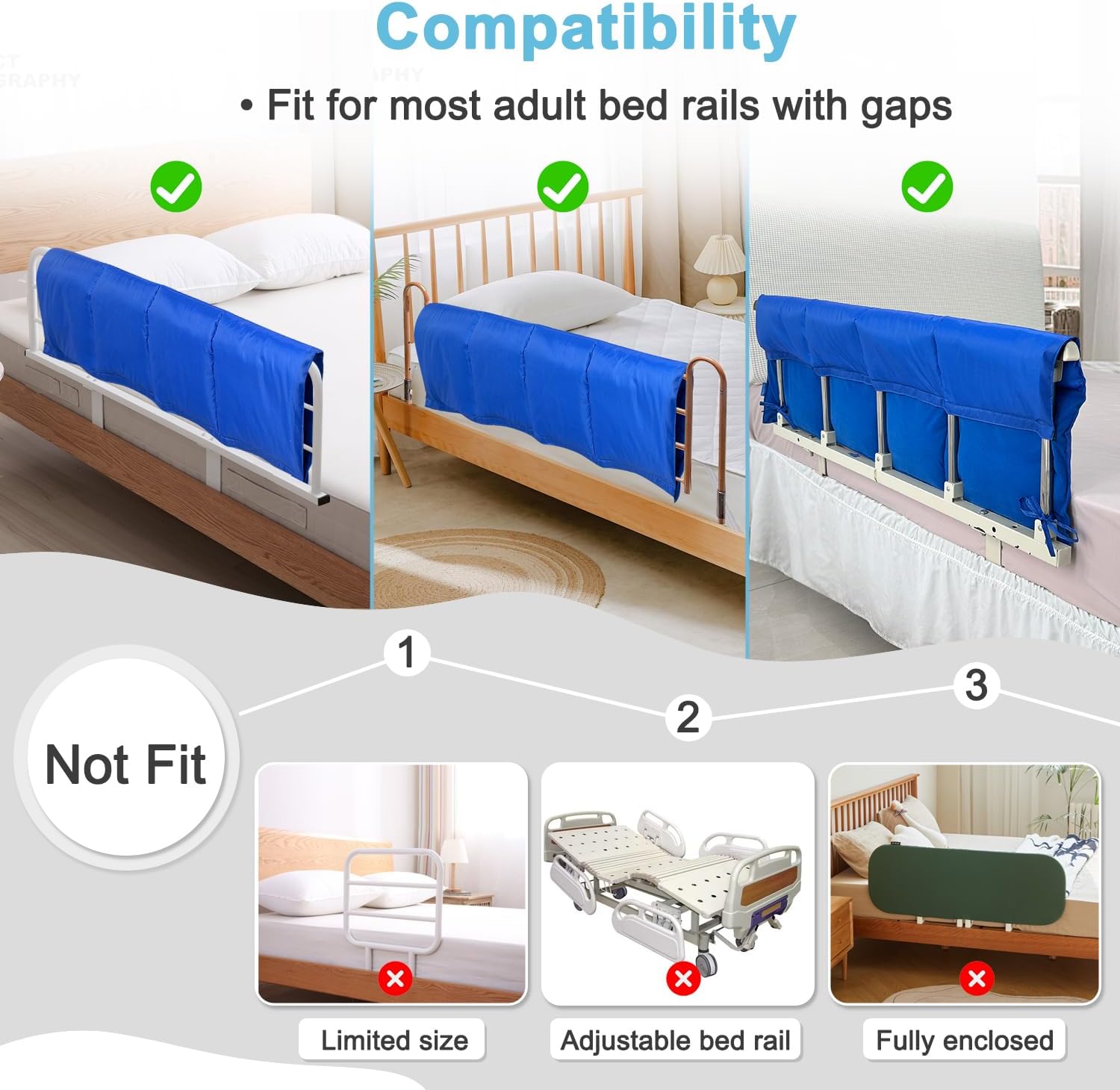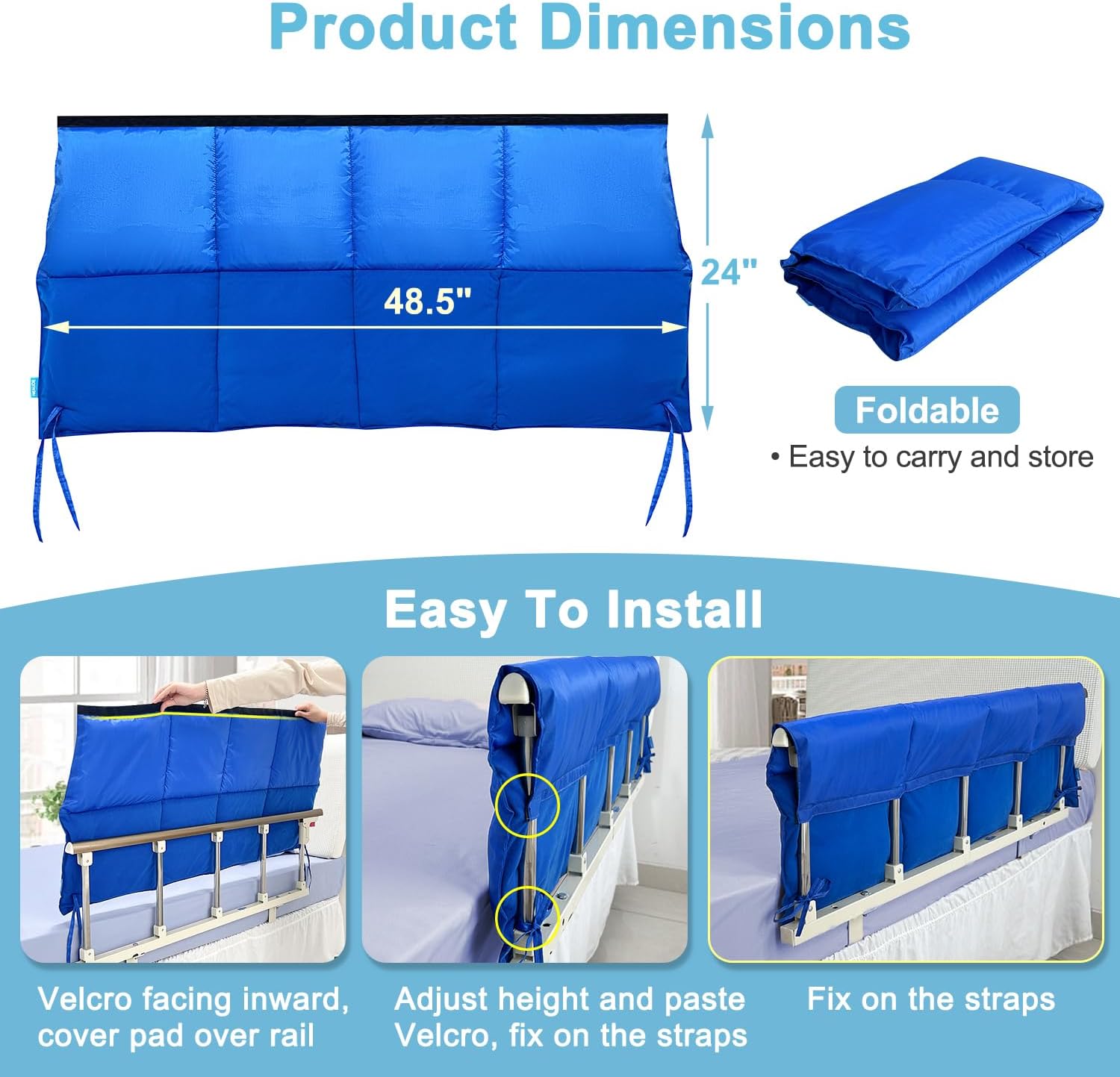 - ăSafety Bed Bumperă48 inches long by 12 inches wide rail padding can easily cover on the bed rails, preventing patients from getting stuck in the gaps of the bed railing and getting pinched. Avoid injuries caused by hitting the bed rail or falling out of bed for the elderly, pregnant women, and children.