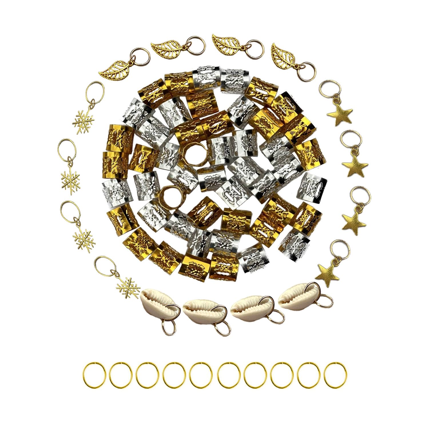 - Get 80 pieces of braids accessories, including hair jewelry rings, metal cuffs, leaves, shells, snowflakes, stars, and hollow-out gold rings.