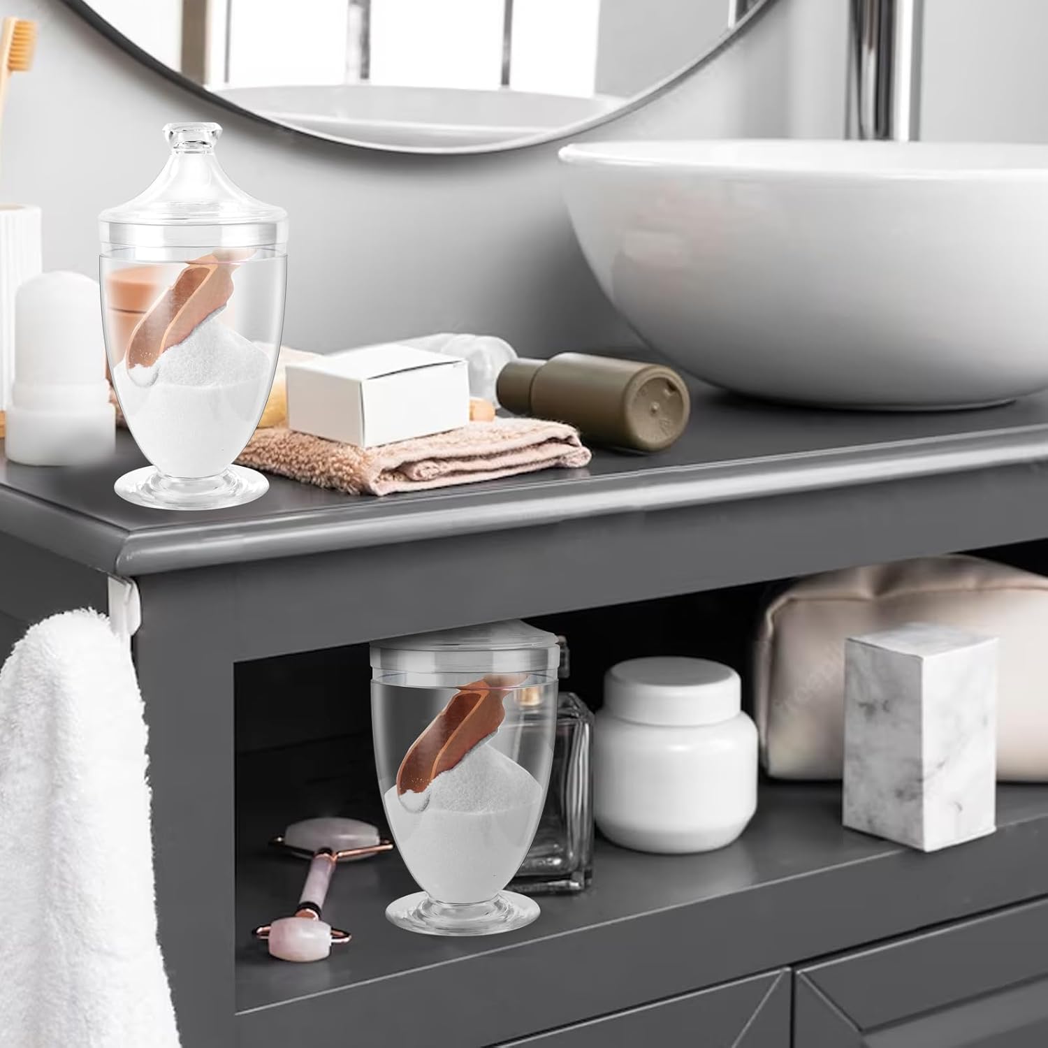 - 1.Package include:Come with a bath salt jar with lid and spoon.It is very suitable for storing bath salts, does not take up too much space, and keeps your bathroom, kitchen, laundry room and other places tidy and beautiful.