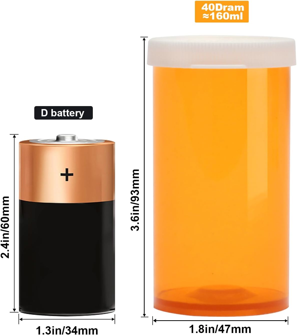 - Perfect Size: Each small plastic prescription vials measures approximately 1.9 x 3.7 inches (47 x 93 mm), 40 dram â 160ml.