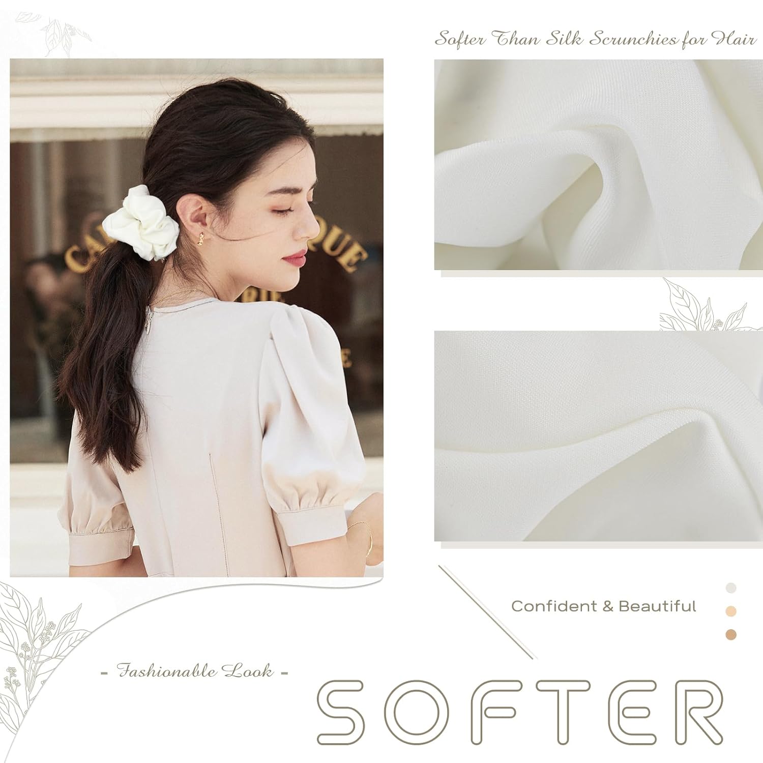 4PCS Large Silk Scrunchies for Women - Hair Elastics Handmade Scrunchie for Thick Hair Girl Hair Ties Ponytail Holders Jumbo Scrunchies (White)
