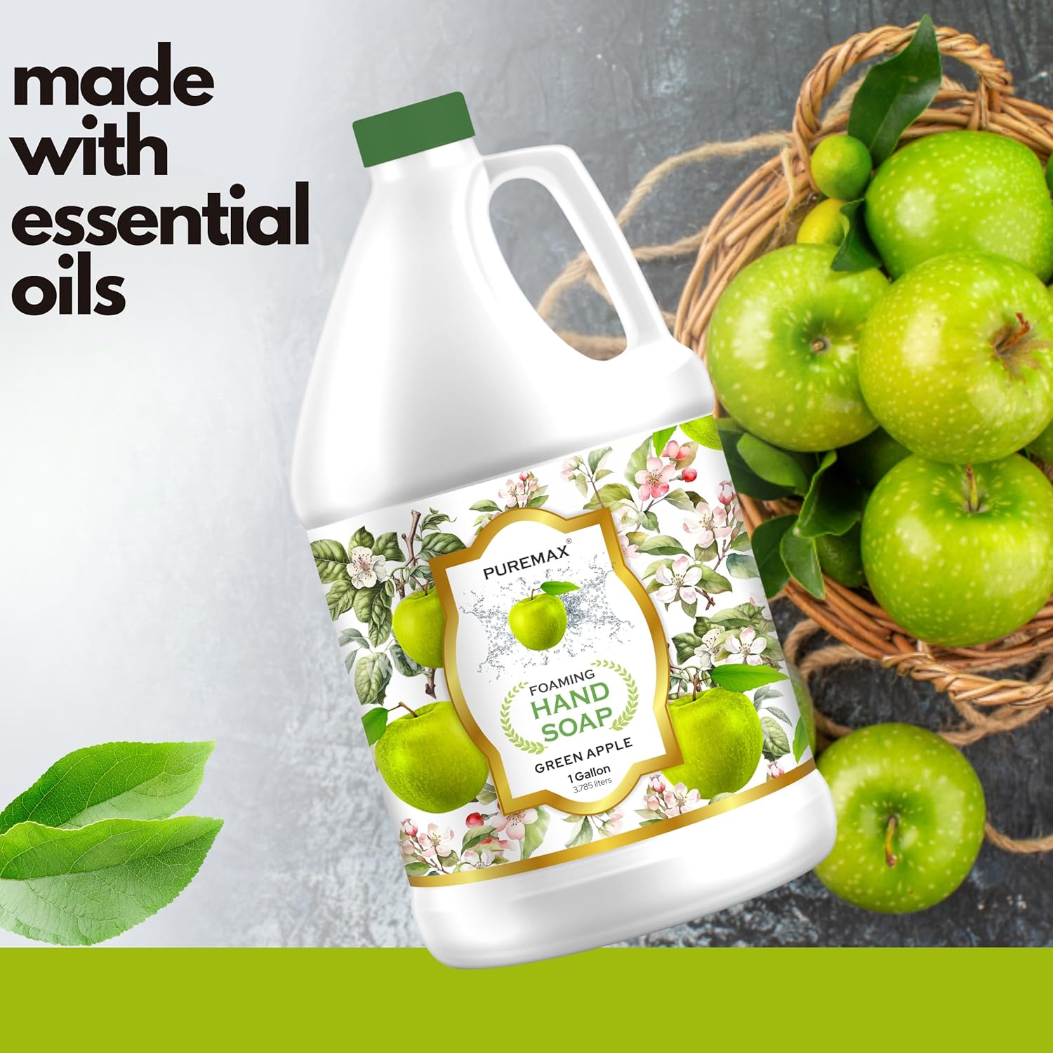 - Our soap's Green Apple offers you a satisfying and pleasant hand washing experience with its lightly scented scent. Plus, our gallon-sized container provides more washes per refill and reduces water use, making it an eco-friendly choice.