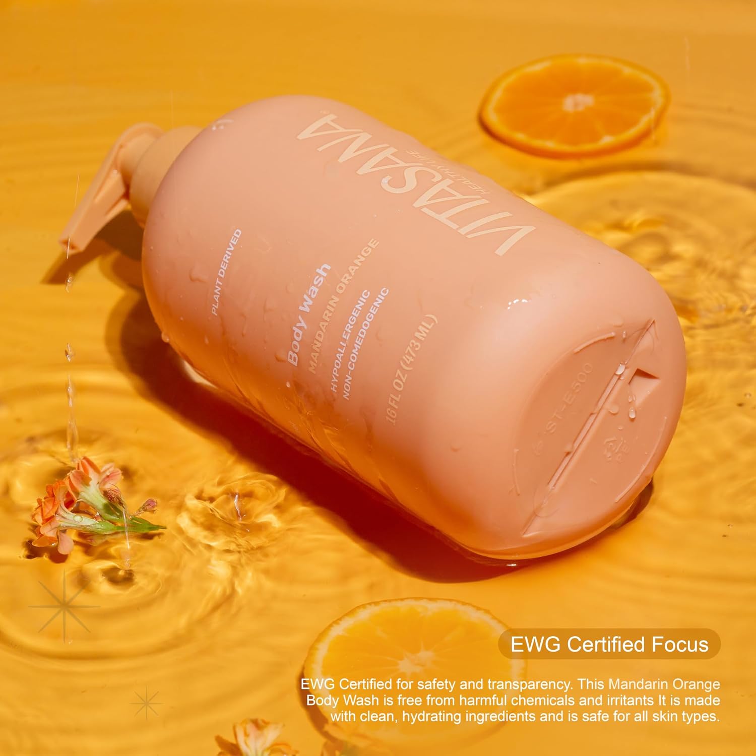 - EWG VERIFIED CLEAN FORMULA – Vitasana Mandarin Orange Body Wash meets the strict safety standards of the EWG Verified program, ensuring it’s free from harmful chemicals like parabens, sulfates, phthalates, petroleum, artificial dyes, synthetic fragrance, nickel, soy, and lanolin. One of fewer than 2,500 products globally to earn this distinction—clean skincare you can trust.