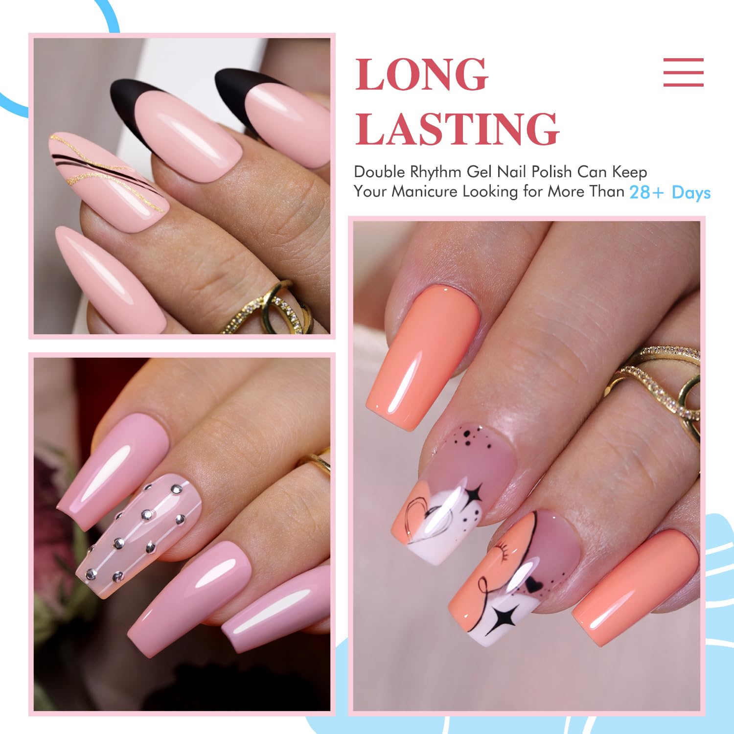 - Nude Pink Gel Nail Polish Set: Double Rhythm pink gel nail polish kit includes 6colors 7.5ml / 0.26 fl.oz gel nail polish. This pink gel nail polish set includes light pink,milky pink ,baby pink ,pink glitter ,nude pink and neon pink 6 colors. They can be combined with each other arbitrarily, so you can creat your own nail art sthle.
