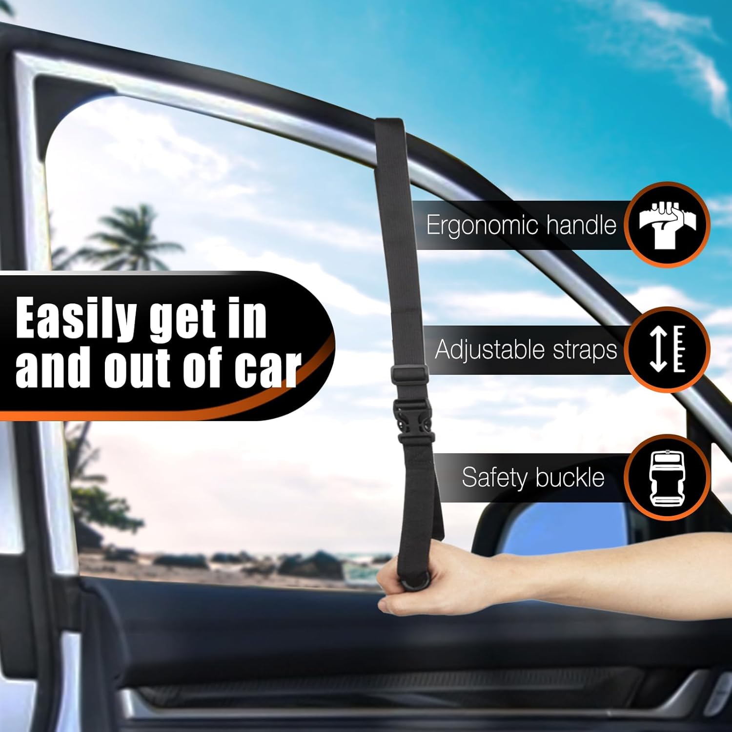 - ăMultifunctional designă Universal most car, Automotive door assist handles not only could help people getting in and out of the car, but also could cutting the seatbelt and breaking the window in an emergency. The strap can be easily placed around the contour of the window and then buckled. Height adjustable strap.