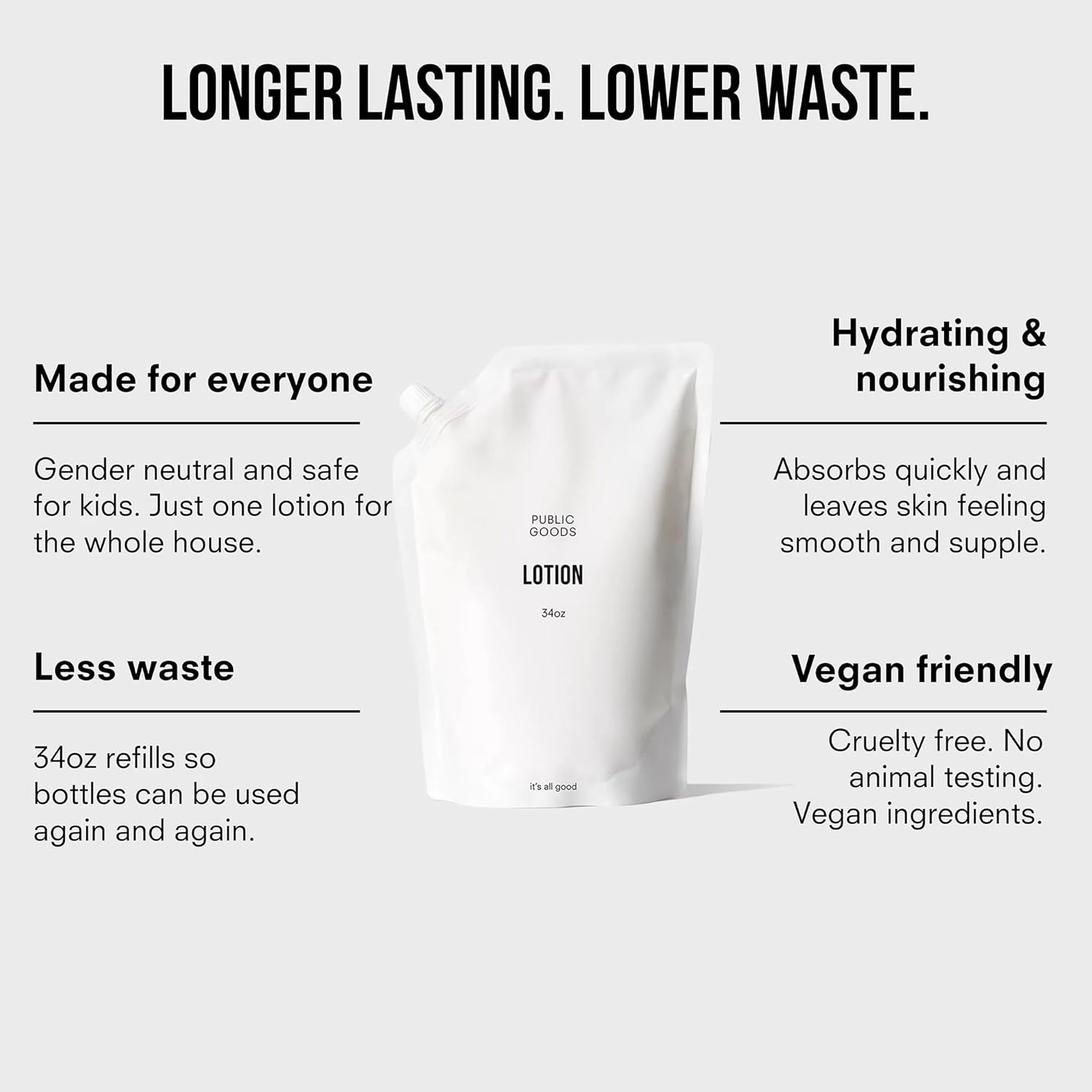 - Less Waste - Designed with sustainability in mind, our 34 ounce lotion is ideal for refilling our 12 ounce bottle or one of your own.