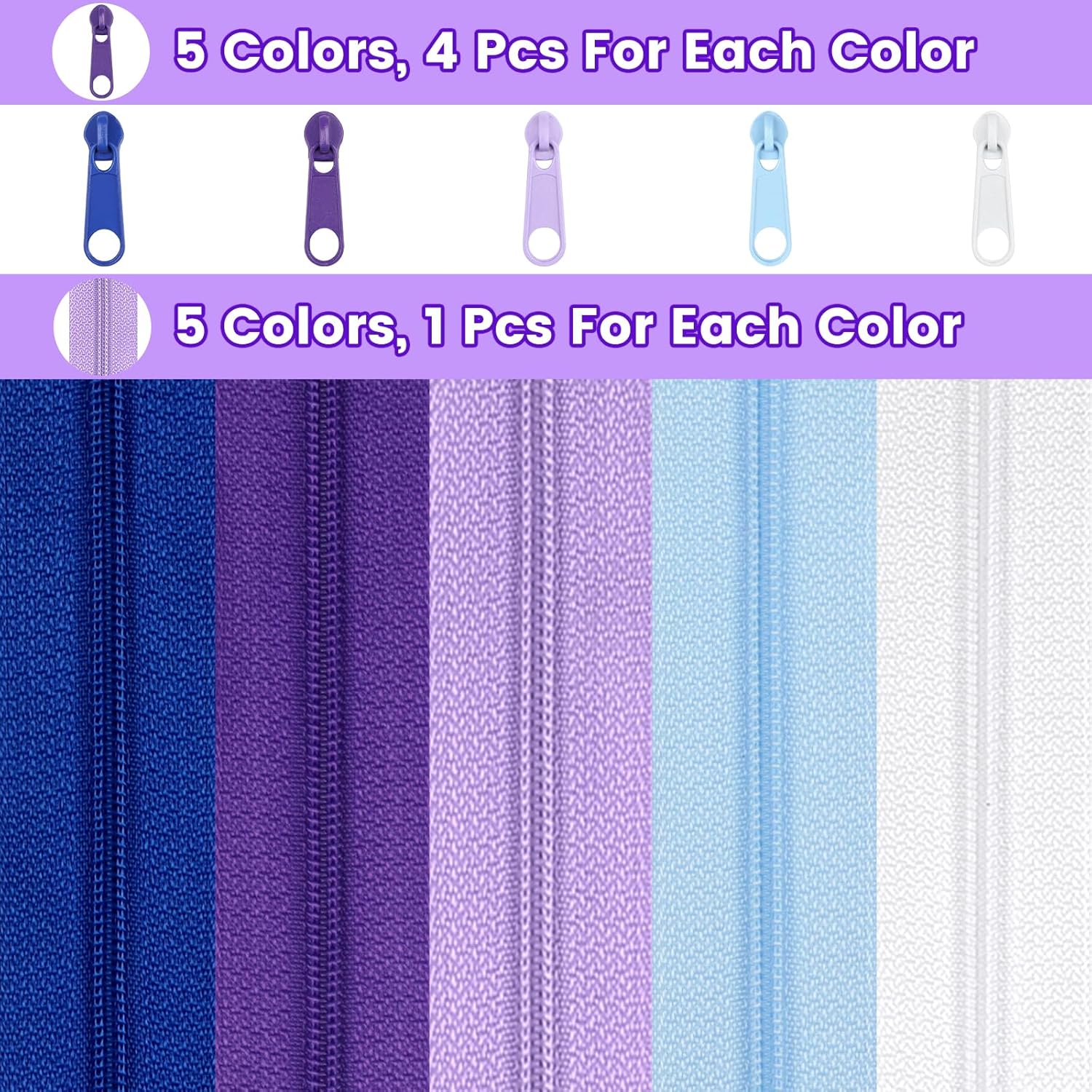 DOITEM 15.3 Yards/ 14 m 5 Pieces Assorted Colors #3 Nylon Coil Zippers, Sewing Zippers Endless Zips with 20 Pieces Zipper Sliders Zip Heads for DIY Sewing Tailor Craft Supplies (Purple Blue White)