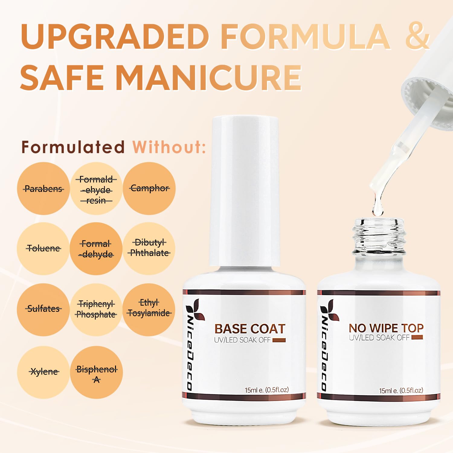 Nicedeco Hema Free No Wipe Gel Top Coat and Base Coat Set 2 Pcs 15ml Low Odor Cruelty Free Vegan Gel Nail Polish Glossy Shine Long Lasting Gel Base Top Coat