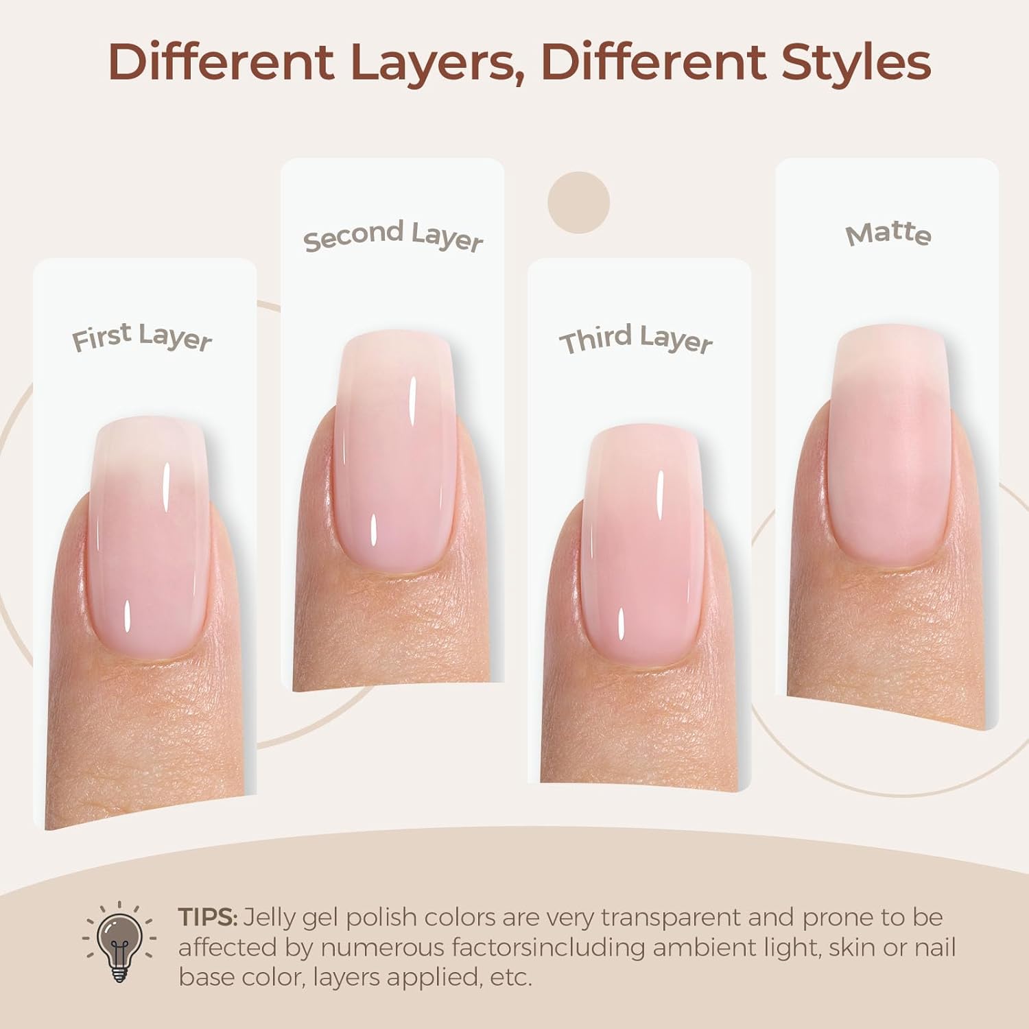 - TIP OF USE - This is a transparent jelly gel nail polish. Applying thinly allows the color to become more even. Most importantly, its effect depends on your nail base color and the number of layers you apply