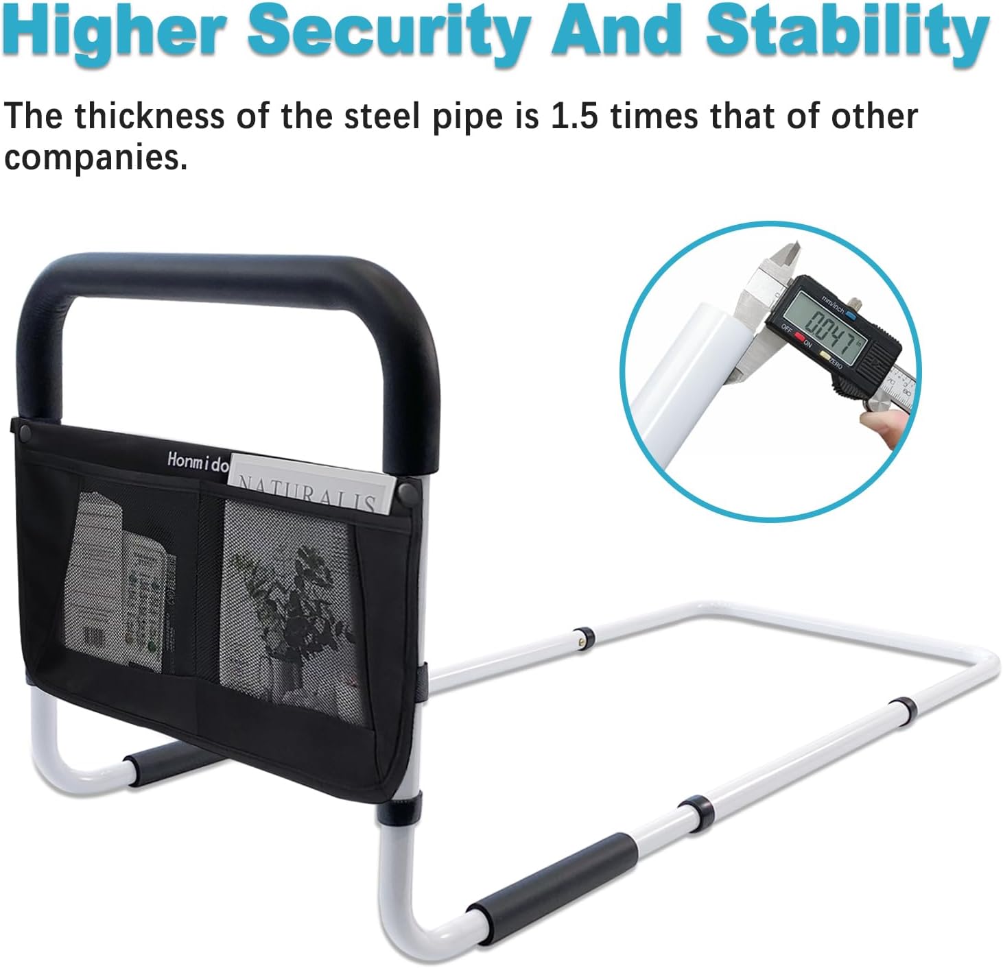 - GREAT STRENGTH: Honmido portable bed rails have a larger and longer chassis area than other bed rails products, the tube wall is thicker, stronger when used by the elderly, Also prevents people from falling out of bed,and the non-slip foam provides better friction between the mattress and the box spring . The seat belt is bound to the other side of the bed and will be more secure