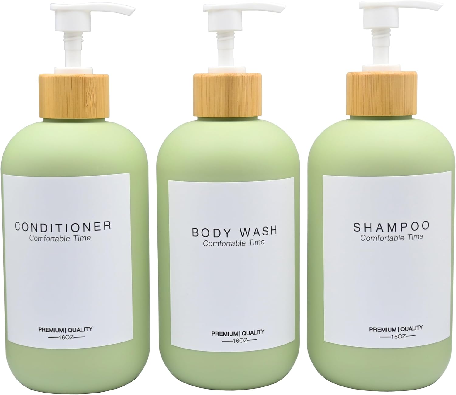 - Premium Quality â Newly upgraded bottles with strengthened thickness and stiffen body, High quality bamboo pump head, perfect collocation full of senior sense. These shampoo and conditioner dispenser refillable plastic bottles are made of BPA-free reinforced PET material, which is durable and doesn't worry about fragility.