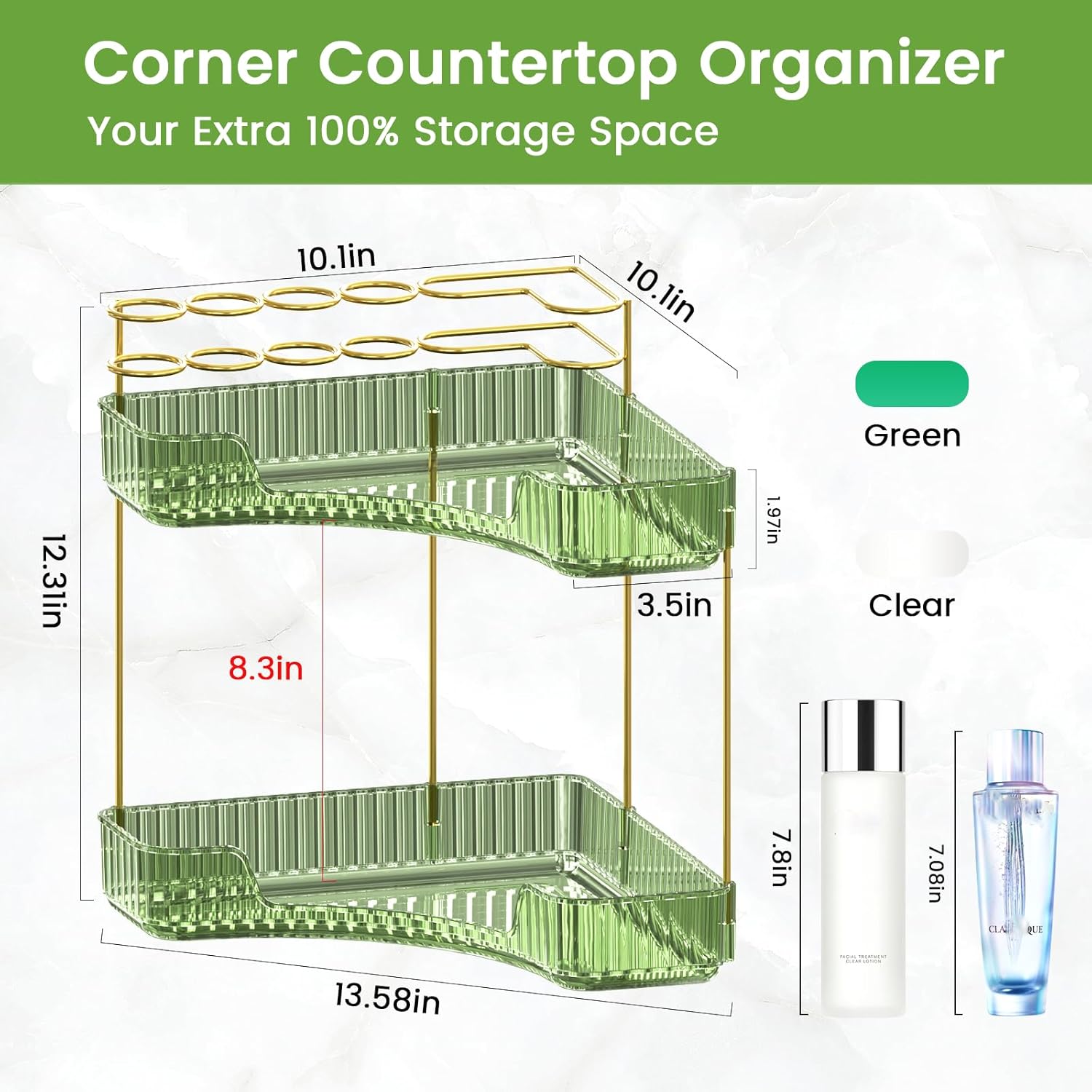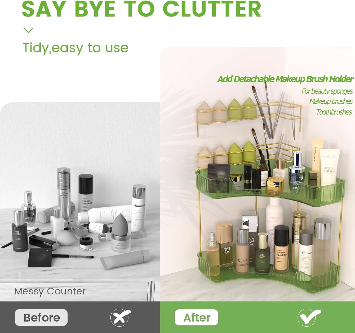 NATURE'S SOURCE Makeup Organizer for Vanity, 2-Tier Corner Bathroom Organizer Countertop with Makeup Brush Holder, Corner Counter Storage for Bathroom Dresser- Green