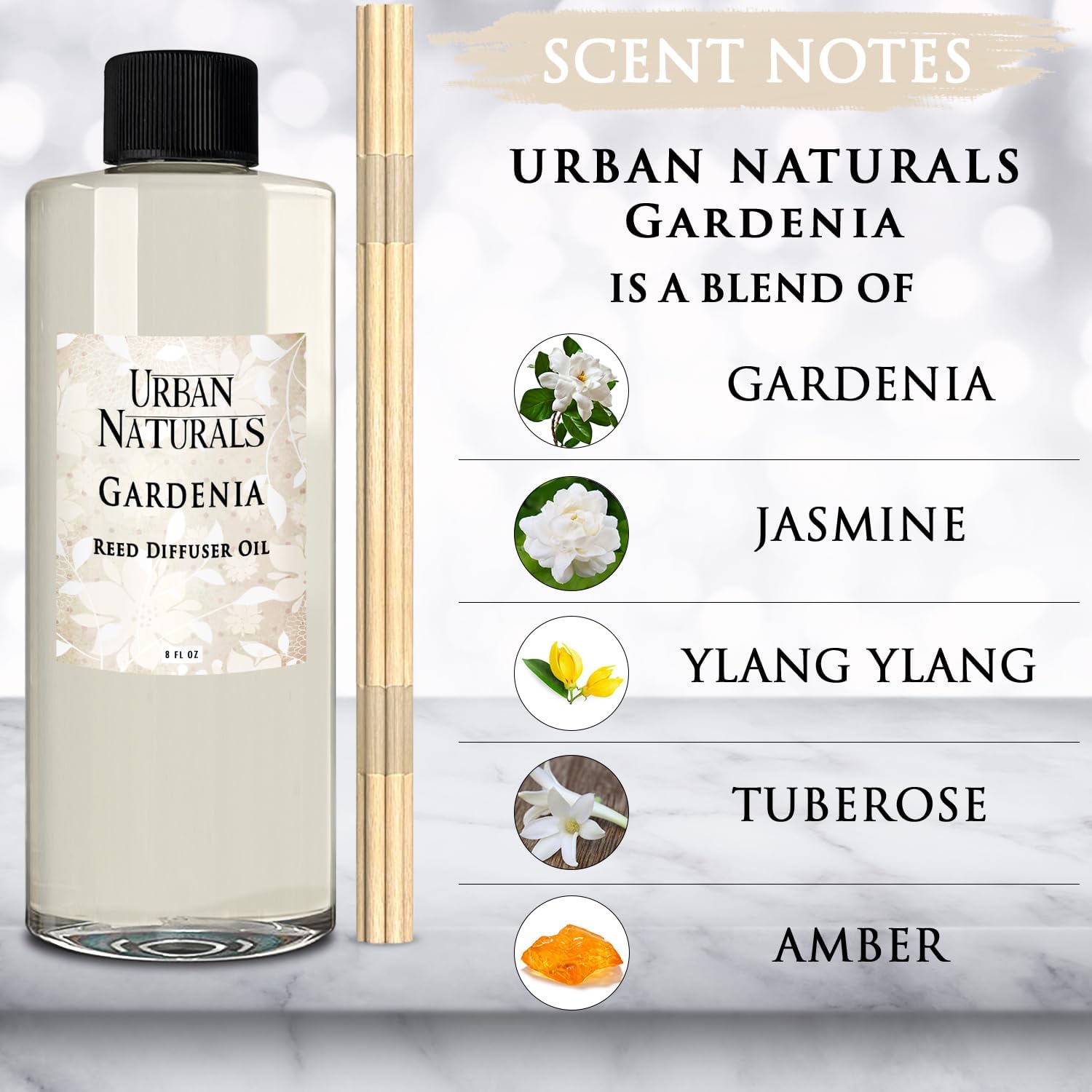 Urban Naturals Reed Diffuser Oil Refill Gardenia with Jasmine, Ylang Ylang, Tuberose, Amber 8 oz + Free Reed Sticks, Made in The USA
