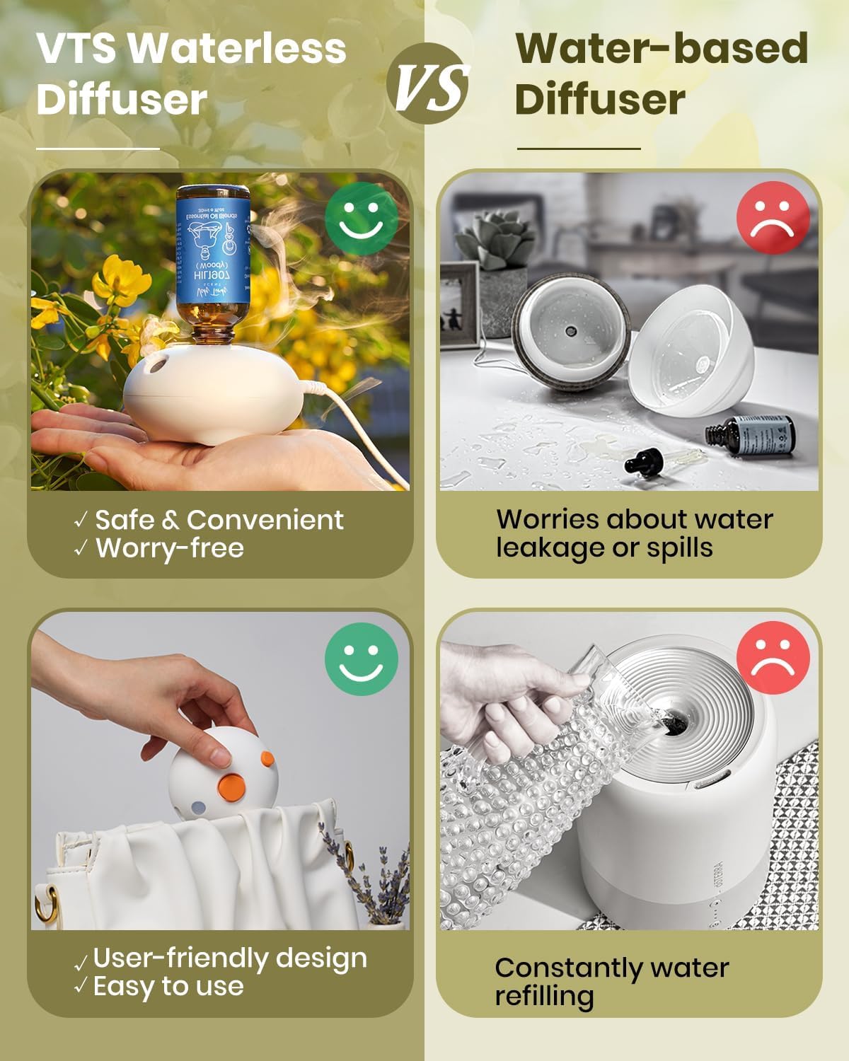- Long-Lasting & Powerful Aroma - A waterless oil diffuser only requires the essential oil diffusers itself and oil diffuser essential oils to function. So say goodbye to water leakage or spills, as well as the hassle of refilling or cleaning a water reservoir. Since no dilution occurs, the intact properties and fragrance of the diffuser oils scents for home can be well preserved by hotel diffuser.