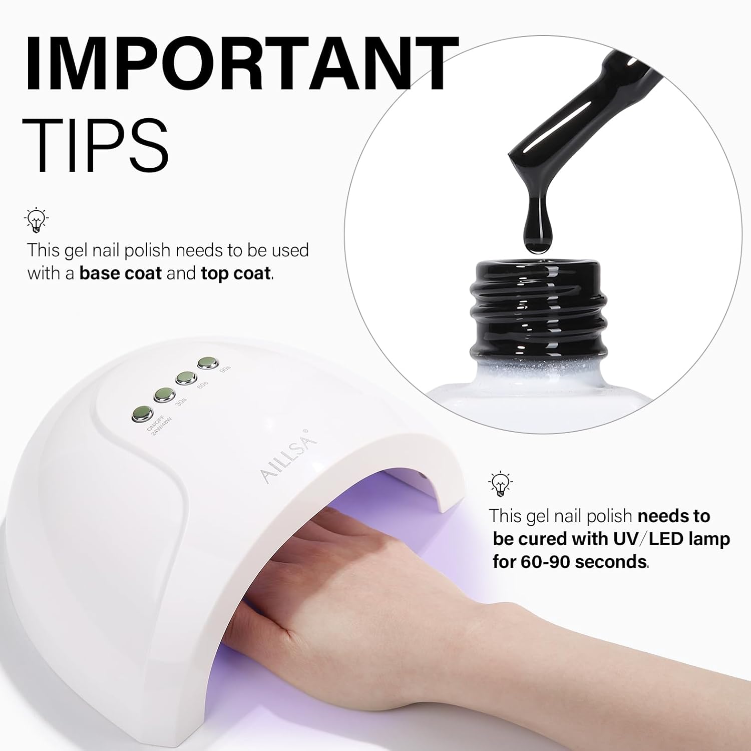 - Long Lasting 21+DaysďźAILLSA gel nail polish needs to be cured under u v lamp, under the correct use steps, it can last for 21-28 days and keep the shiny luster. You'll never have to worry about your nails peeling off while showering and doing housework. Let AILLSA serve you a longer time!
