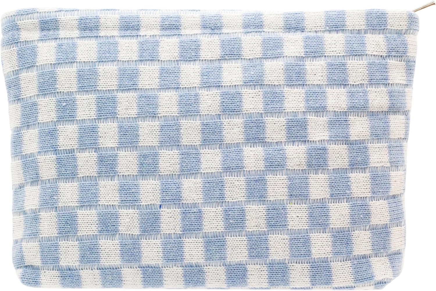 PAZIMIIK Knit Checkered Makeup Bag Large Zipper Make Up Accessory Pouch for Purse Cosmetic Brush Bag for Travel Essential,Blue