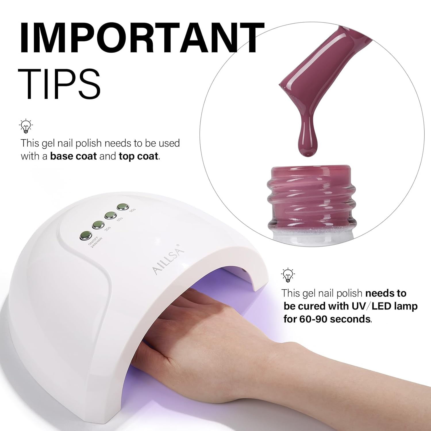 - LONG-LASTING SHINE: AILLSA fall winter gel nail polish needs to be cured under L E D/U V light, under the correct use steps, it can last for 21-28 days and keep the shiny luster. You'll never have to worry about your nails peeling off while showering and doing housework. Let AILLSA serve you a longer time!