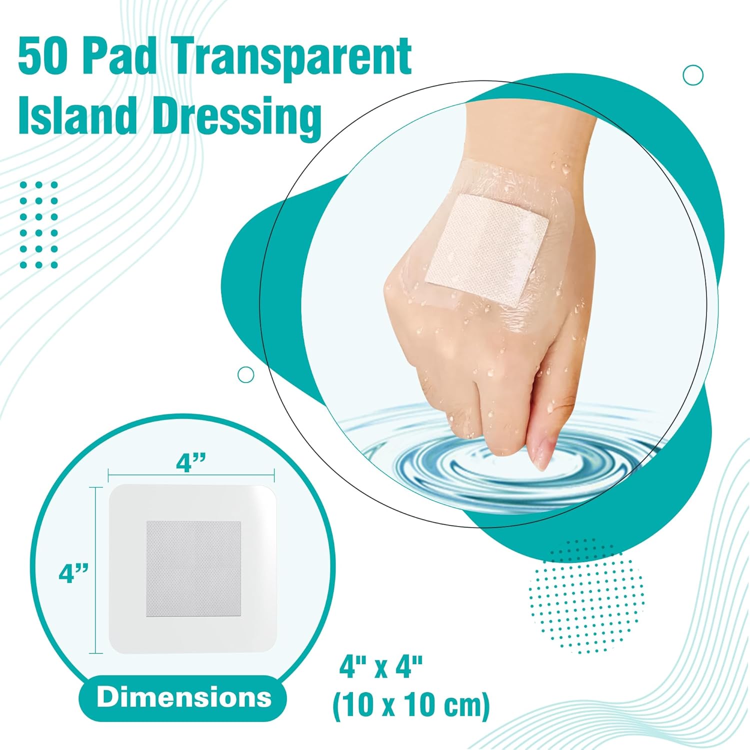General Medi Waterproof Transparent Adhesive Island Dressing (50 Count, 4" x 4"), Wound Care Pad with Adhesive Border - Sterile, Soft & Highly Absorbent Medical Grade Dressing Pad