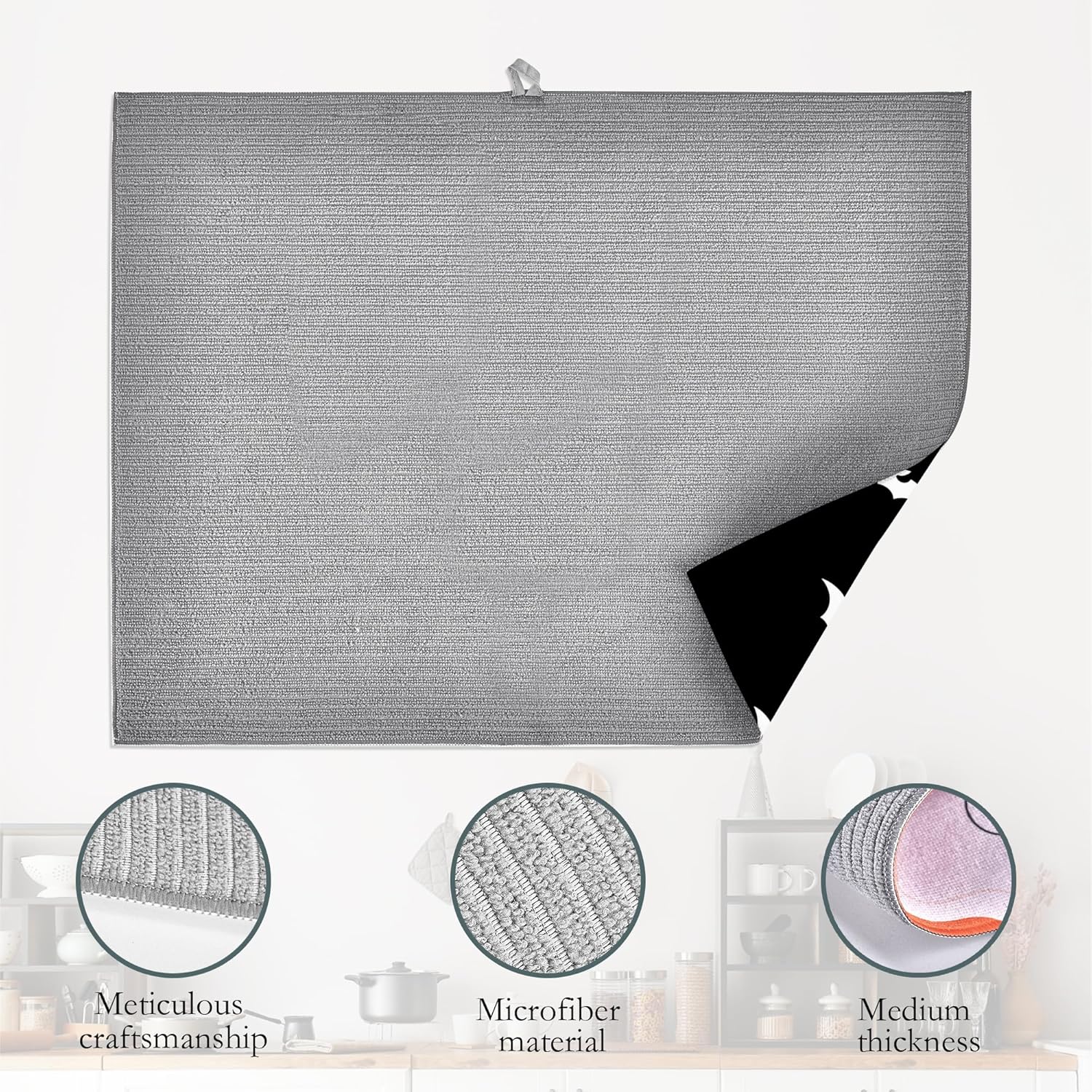 - QUICK DRY: Microfiber terry cloth on the other side absorbs 4X its weight in water, easily keep your counter dry. Our drying mat will suck up all the leftover wetness from your pots, pans, and dishes, and leave the underside both dry. Use alone or pair with a dish drying rack.Offered in rich color options these drying mats are the perfect functional addition to your kitchen decor.
