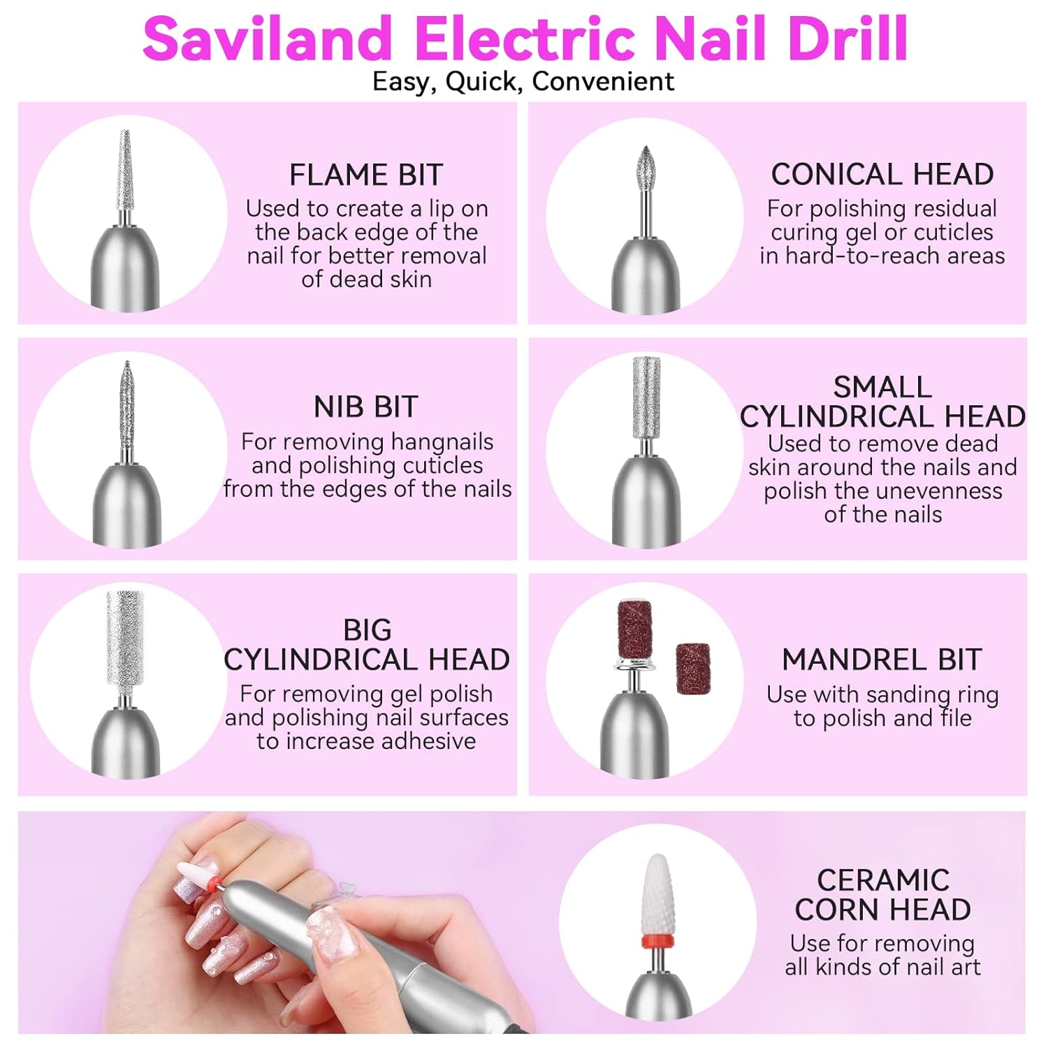 - Efficient Electric Nail File & Portable Nail Lamp: Saviland USB electric nail drill set contains many different drill bits and sanding bands. Adjustable steering and rotation speed, safe, easy to use, and more effective than traditional nail files. Ideal for quick sanding, carving, cutting, polishing, nail removal and dead skin and cuticle removal. The portable mini nail lamp can help you cure all gels and improve the efficiency of nail curing.