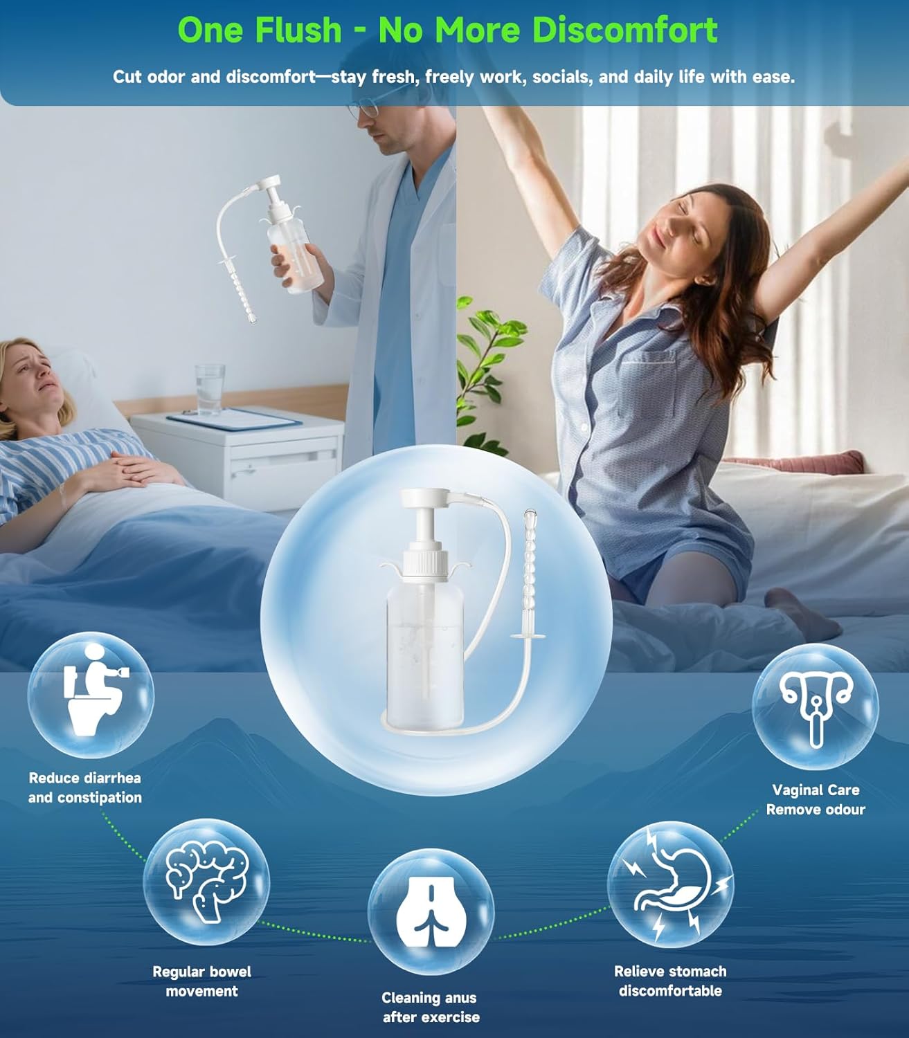 - 【Pump head design for increased water output and impact】 - This enema bottle kit holds up to 300ml and provides better control than an enema bulb. It's perfect for on-the-go use, making it easy to stay clean while traveling. The pump features a syringe-style handle for one-handed use and allows for more controlled water flow, so you can easily adjust the amount of fluid with each pump.
