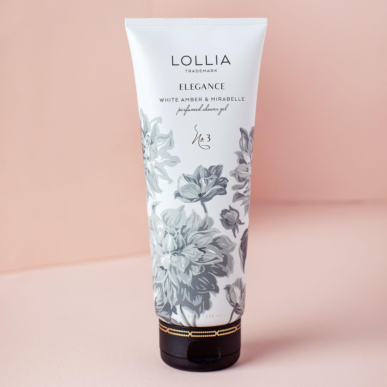- WHITE AMBER & MIRABELLE: Lollia Elegance Shower Gel creates a luxurious lather with hydrating ingredients that condition and cleanse. The body soap is perfumed with delicate notes of White Amber and Mirabelle that leaves the skin beautifully scented.