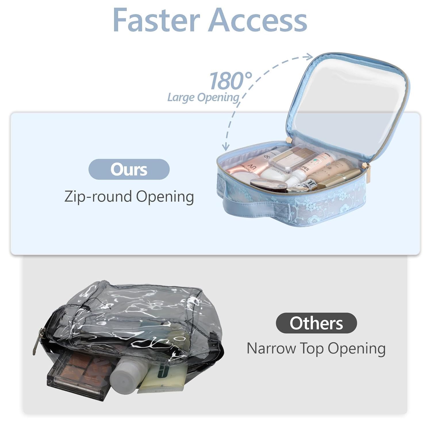 - Zip-around Opening, Easy to Use: Double zippers can be opened by 180%, so the clear travel bags for toiletries can be flip-opened horizontally, facilitating access to travel essentials. The humanized handle design allows this clear bag to be lifted and hung conveniently